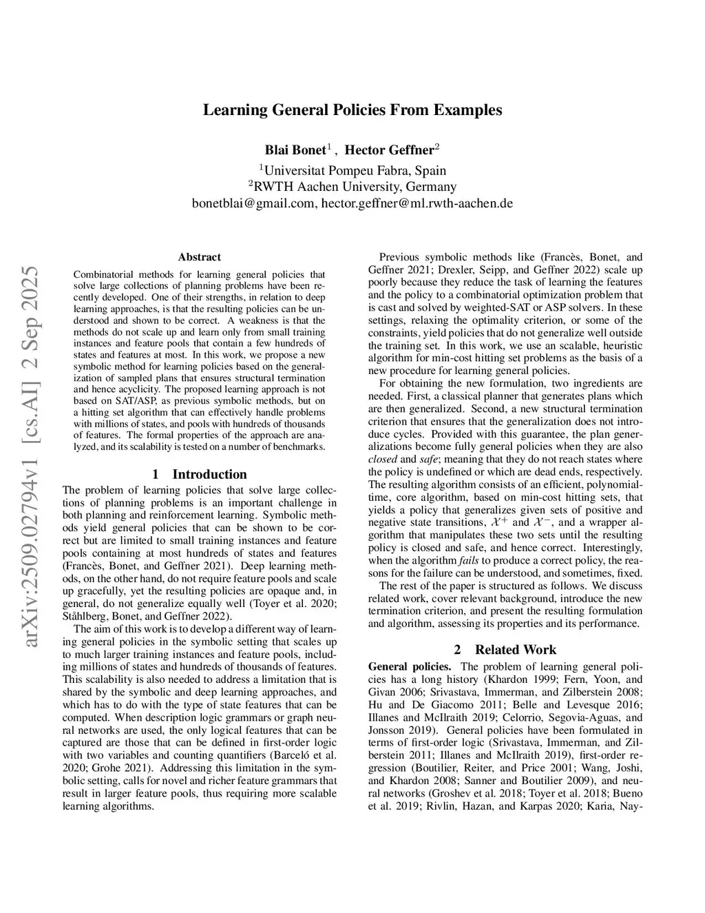 Learning General Policies From Examples