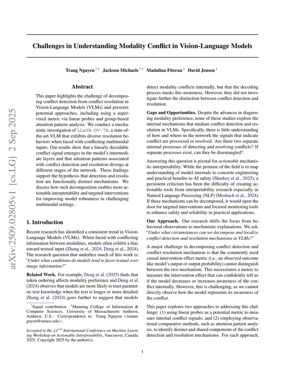This paper highlights the challenge of decomposing conflict detection from conflict resolution in Vision-Language Models (VLMs) and presents potential approaches, including using a supervised metric via linear probes and group-based attention pattern analysis. We conduct a mechanistic investigation of LLaVA-OV-7B, a state-of-the-art VLM that exhibits diverse resolution behaviors when faced with conflicting multimodal inputs. Our results show that a linearly decodable conflict signal emerges in the model's intermediate layers and that attention patterns associated with conflict detection and resolution diverge at different stages of the network. These findings support the hypothesis that detection and resolution are functionally distinct mechanisms. We discuss how such decomposition enables more actionable interpretability and targeted interventions for improving model robustness in challenging multimodal settings.