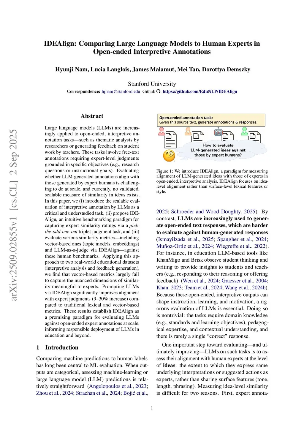 Large language models (LLMs) are increasingly applied to open-ended, interpretive annotation tasks, such as thematic analysis by researchers or generating feedback on student work by teachers. These tasks involve free-text annotations requiring expert-level judgments grounded in specific objectives (e.g., research questions or instructional goals). Evaluating whether LLM-generated annotations align with those generated by expert humans is challenging to do at scale, and currently, no validated, scalable measure of similarity in ideas exists. In this paper, we (i) introduce the scalable evaluation of interpretive annotation by LLMs as a critical and understudied task, (ii) propose IDEAlgin, an intuitive benchmarking paradigm for capturing expert similarity ratings via a "pick-the-odd-one-out" triplet judgment task, and (iii) evaluate various similarity metrics, including vector-based ones (topic models, embeddings) and LLM-as-a-judge via IDEAlgin, against these human benchmarks. Applying this approach to two real-world educational datasets (interpretive analysis and feedback generation), we find that vector-based metrics largely fail to capture the nuanced dimensions of similarity meaningful to experts. Prompting LLMs via IDEAlgin significantly improves alignment with expert judgments (9-30% increase) compared to traditional lexical and vector-based metrics. These results establish IDEAlgin as a promising paradigm for evaluating LLMs against open-ended expert annotations at scale, informing responsible deployment of LLMs in education and beyond.