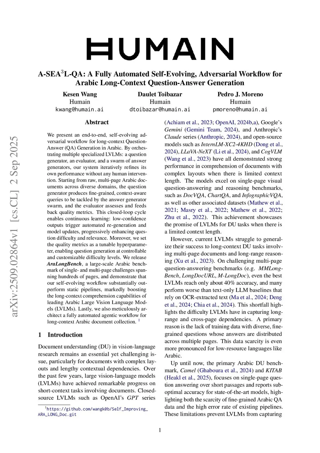 We present an end-to-end, self-evolving adversarial workflow for long-context Question-Answer (QA) Generation in Arabic. By orchestrating multiple specialized LVLMs: a question generator, an evaluator, and a swarm of answer generators, our system iteratively refines its own performance without any human intervention. Starting from raw, multi-page Arabic documents across diverse domains, the question generator produces fine-grained, context-aware queries to be tackled by the answer generator swarm, and the evaluator assesses and feeds back quality metrics. This closed-loop cycle enables continuous learning: low-confidence outputs trigger automated re-generation and model updates, progressively enhancing question difficulty and relevance. Moreover, we set the quality metrics as a tunable hyperparameter, enabling question generation at controllable and customizable difficulty levels. We release AraLongBench, a large-scale Arabic benchmark of single- and multi-page challenges spanning hundreds of pages, and demonstrate that our self-evolving workflow substantially outperform static pipelines, markedly boosting the long-context comprehension capabilities of leading Arabic Large Vision Language Models (LVLMs). Lastly, we also meticulously architect a fully automated agentic workflow for long-context Arabic document collection.