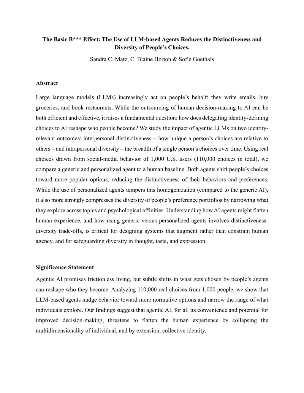 The Basic B*** Effect: The Use of LLM-based Agents Reduces the Distinctiveness and Diversity of People's Choices