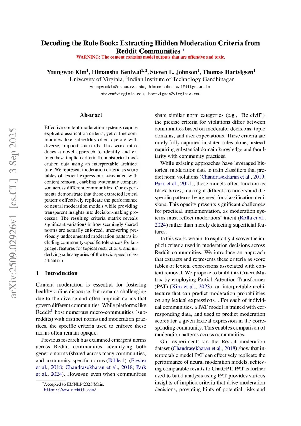 Effective content moderation systems require explicit classification criteria, yet online communities like subreddits often operate with diverse, implicit standards. This work introduces a novel approach to identify and extract these implicit criteria from historical moderation data using an interpretable architecture. We represent moderation criteria as score tables of lexical expressions associated with content removal, enabling systematic comparison across different communities. Our experiments demonstrate that these extracted lexical patterns effectively replicate the performance of neural moderation models while providing transparent insights into decision-making processes. The resulting criteria matrix reveals significant variations in how seemingly shared norms are actually enforced, uncovering previously undocumented moderation patterns including community-specific tolerances for language, features for topical restrictions, and underlying subcategories of the toxic speech classification.
