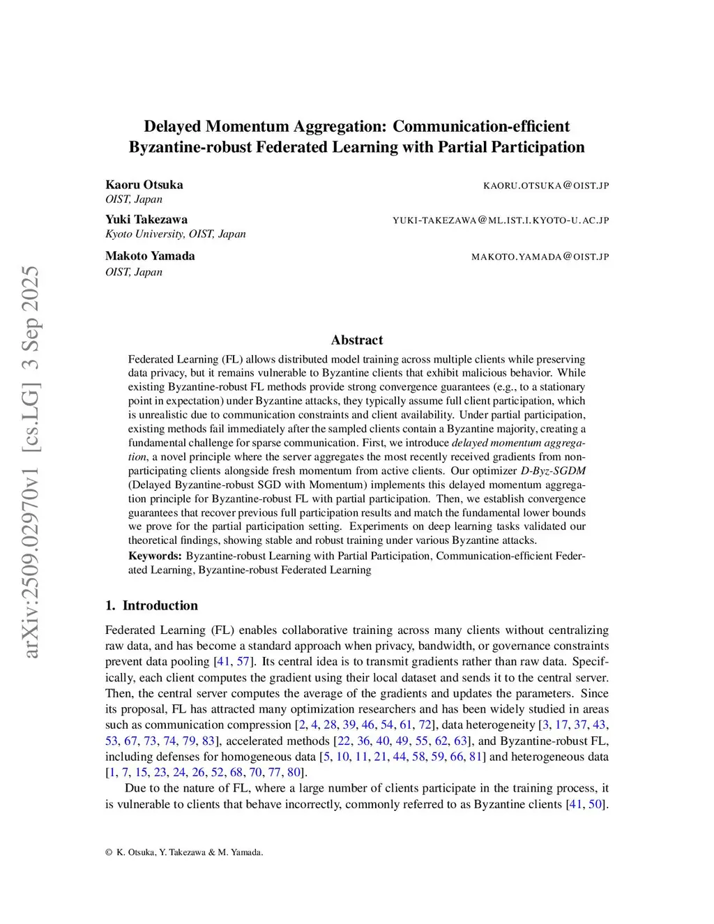 Partial participation is essential for communication-efficient federated learning at scale, yet existing Byzantine-robust methods typically assume full client participation. In the partial participation setting, a majority of the sampled clients may be Byzantine, once Byzantine clients dominate, existing methods break down immediately. We introduce delayed momentum aggregation, a principle where the central server aggregates cached momentum from non-sampled clients along with fresh momentum from sampled clients. This principle ensures Byzantine clients remain a minority from the server's perspective even when they dominate the sampled set. We instantiate this principle in our optimizer DeMoA. We analyze the convergence rate of DeMoA, showing that DeMoA is Byzantine-robust under partial participation. Experiments show that, with 20% Byzantine ratio and only 10% partial participation rate, DeMoA achieves the best accuracy even when existing methods fail empirically.