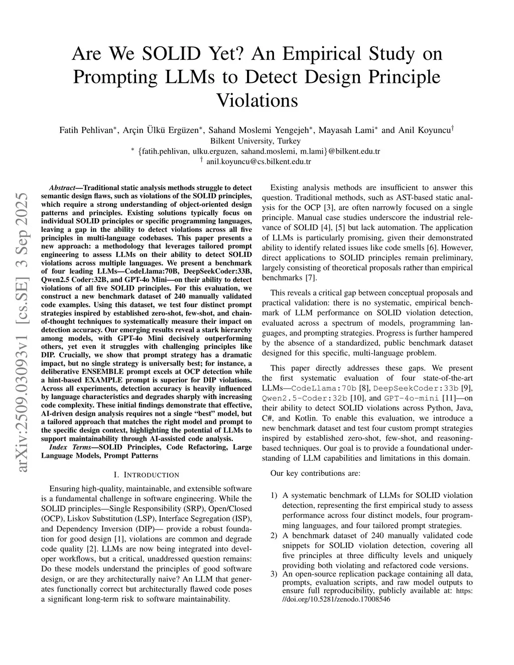 Traditional static analysis methods struggle to detect semantic design flaws, such as violations of the SOLID principles, which require a strong understanding of object-oriented design patterns and principles. Existing solutions typically focus on individual SOLID principles or specific programming languages, leaving a gap in the ability to detect violations across all five principles in multi-language codebases. This paper presents a new approach: a methodology that leverages tailored prompt engineering to assess LLMs on their ability to detect SOLID violations across multiple languages. We present a benchmark of four leading LLMs-CodeLlama, DeepSeekCoder, QwenCoder, and GPT-4o Mini-on their ability to detect violations of all five SOLID principles. For this evaluation, we construct a new benchmark dataset of 240 manually validated code examples. Using this dataset, we test four distinct prompt strategies inspired by established zero-shot, few-shot, and chain-of-thought techniques to systematically measure their impact on detection accuracy. Our emerging results reveal a stark hierarchy among models, with GPT-4o Mini decisively outperforming others, yet even struggles with challenging principles like DIP. Crucially, we show that prompt strategy has a dramatic impact, but no single strategy is universally best; for instance, a deliberative ENSEMBLE prompt excels at OCP detection while a hint-based EXAMPLE prompt is superior for DIP violations. Across all experiments, detection accuracy is heavily influenced by language characteristics and degrades sharply with increasing code complexity. These initial findings demonstrate that effective, AI-driven design analysis requires not a single best model, but a tailored approach that matches the right model and prompt to the specific design context, highlighting the potential of LLMs to support maintainability through AI-assisted code analysis.