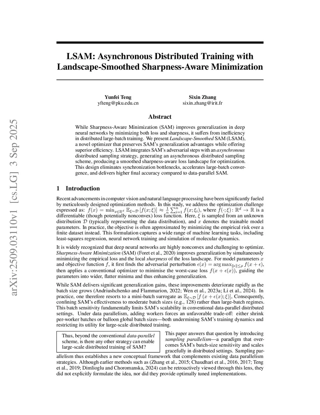 While Sharpness-Aware Minimization (SAM) improves generalization in deep neural networks by minimizing both loss and sharpness, it suffers from inefficiency in distributed large-batch training. We present Landscape-Smoothed SAM (LSAM), a novel optimizer that preserves SAM's generalization advantages while offering superior efficiency. LSAM integrates SAM's adversarial steps with an asynchronous distributed sampling strategy, generating an asynchronous distributed sampling scheme, producing a smoothed sharpness-aware loss landscape for optimization. This design eliminates synchronization bottlenecks, accelerates large-batch convergence, and delivers higher final accuracy compared to data-parallel SAM.