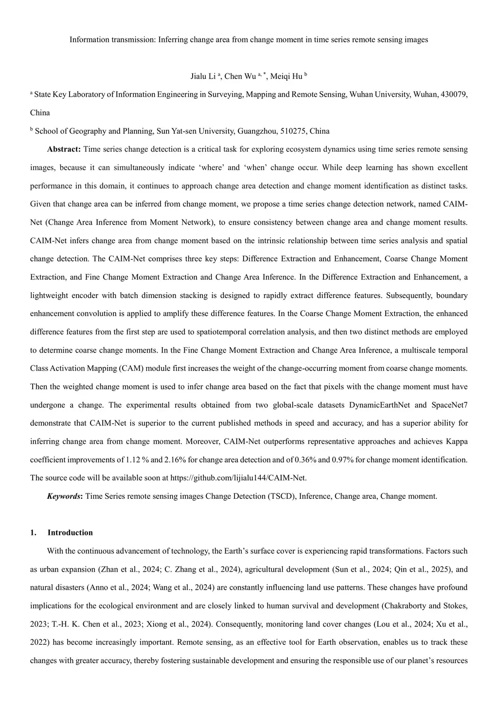 Time series change detection is a critical task for exploring ecosystem dynamics using time series remote sensing images, because it can simultaneously indicate where and when change occur. While deep learning has shown excellent performance in this domain, it continues to approach change area detection and change moment identification as distinct tasks. Given that change area can be inferred from change moment, we propose a time series change detection network, named CAIM-Net (Change Area Inference from Moment Network), to ensure consistency between change area and change moment results. CAIM-Net infers change area from change moment based on the intrinsic relationship between time series analysis and spatial change detection. The CAIM-Net comprises three key steps: Difference Extraction and Enhancement, Coarse Change Moment Extraction, and Fine Change Moment Extraction and Change Area Inference. In the Difference Extraction and Enhancement, a lightweight encoder with batch dimension stacking is designed to rapidly extract difference features. Subsequently, boundary enhancement convolution is applied to amplify these difference features. In the Coarse Change Moment Extraction, the enhanced difference features from the first step are used to spatiotemporal correlation analysis, and then two distinct methods are employed to determine coarse change moments. In the Fine Change Moment Extraction and Change Area Inference, a multiscale temporal Class Activation Mapping (CAM) module first increases the weight of the change-occurring moment from coarse change moments. Then the weighted change moment is used to infer change area based on the fact that pixels with the change moment must have undergone a change.