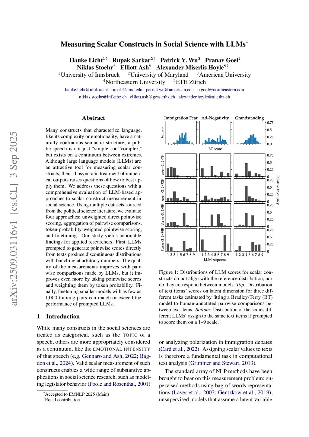 Many constructs that characterize language, like its complexity or emotionality, have a naturally continuous semantic structure; a public speech is not just "simple" or "complex," but exists on a continuum between extremes. Although large language models (LLMs) are an attractive tool for measuring scalar constructs, their idiosyncratic treatment of numerical outputs raises questions of how to best apply them. We address these questions with a comprehensive evaluation of LLM-based approaches to scalar construct measurement in social science. Using multiple datasets sourced from the political science literature, we evaluate four approaches: unweighted direct pointwise scoring, aggregation of pairwise comparisons, token-probability-weighted pointwise scoring, and finetuning. Our study finds that pairwise comparisons made by LLMs produce better measurements than simply prompting the LLM to directly output the scores, which suffers from bunching around arbitrary numbers. However, taking the weighted mean over the token probability of scores further improves the measurements over the two previous approaches. Finally, finetuning smaller models with as few as 1,000 training pairs can match or exceed the performance of prompted LLMs.