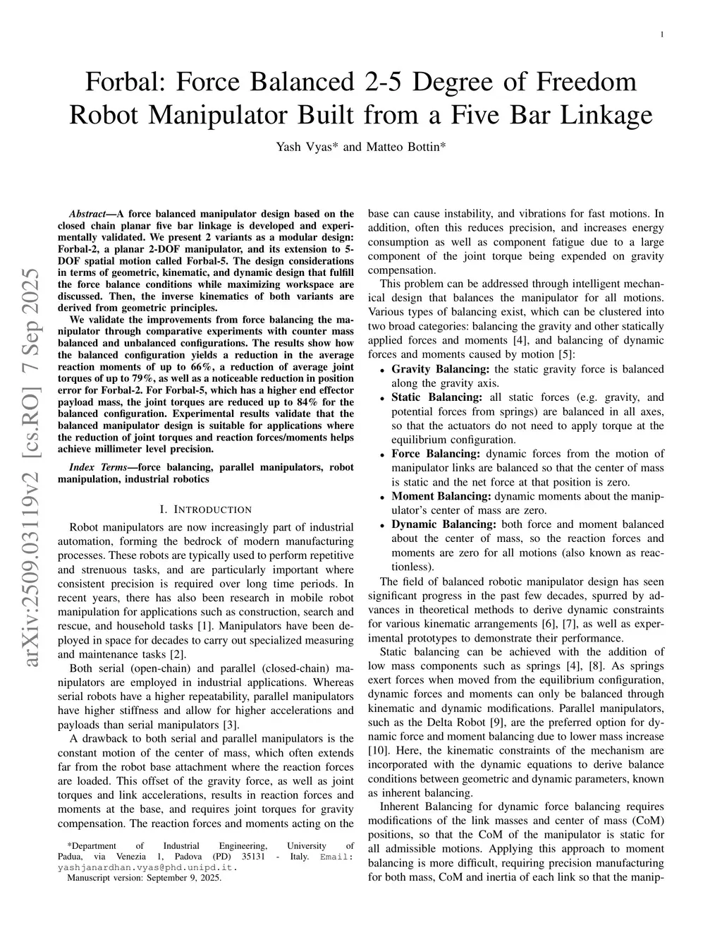 Forbal: Force Balanced 2-5 Degree of Freedom Robot Manipulator Built from a Five Bar Linkage