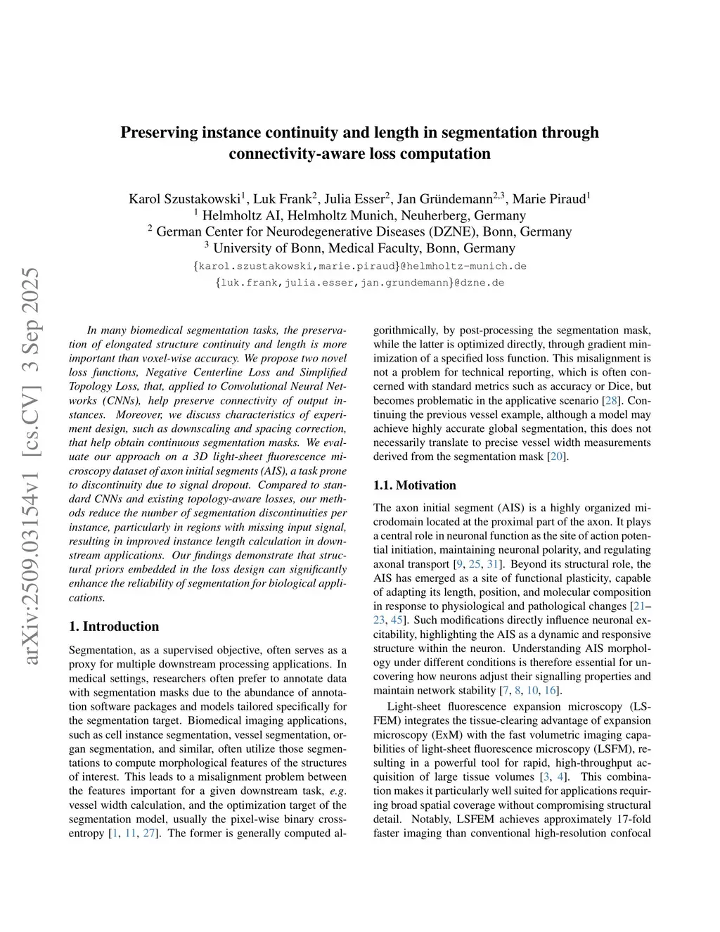 In many biomedical segmentation tasks, the preservation of elongated structure continuity and length is more important than voxel-wise accuracy. We propose two novel loss functions, Negative Centerline Loss and Simplified Topology Loss, that, applied to Convolutional Neural Networks (CNNs), help preserve connectivity of output instances. Moreover, we discuss characteristics of experiment design, such as downscaling and spacing correction, that help obtain continuous segmentation masks. We evaluate our approach on a 3D light-sheet fluorescence microscopy dataset of axon initial segments (AIS), a task prone to discontinuity due to signal dropout. Compared to standard CNNs and existing topology-aware losses, our methods reduce the number of segmentation discontinuities per instance, particularly in regions with missing input signal, resulting in improved instance length calculation in downstream applications. Our findings demonstrate that structural priors embedded in the loss design can significantly enhance the reliability of segmentation for biological applications.