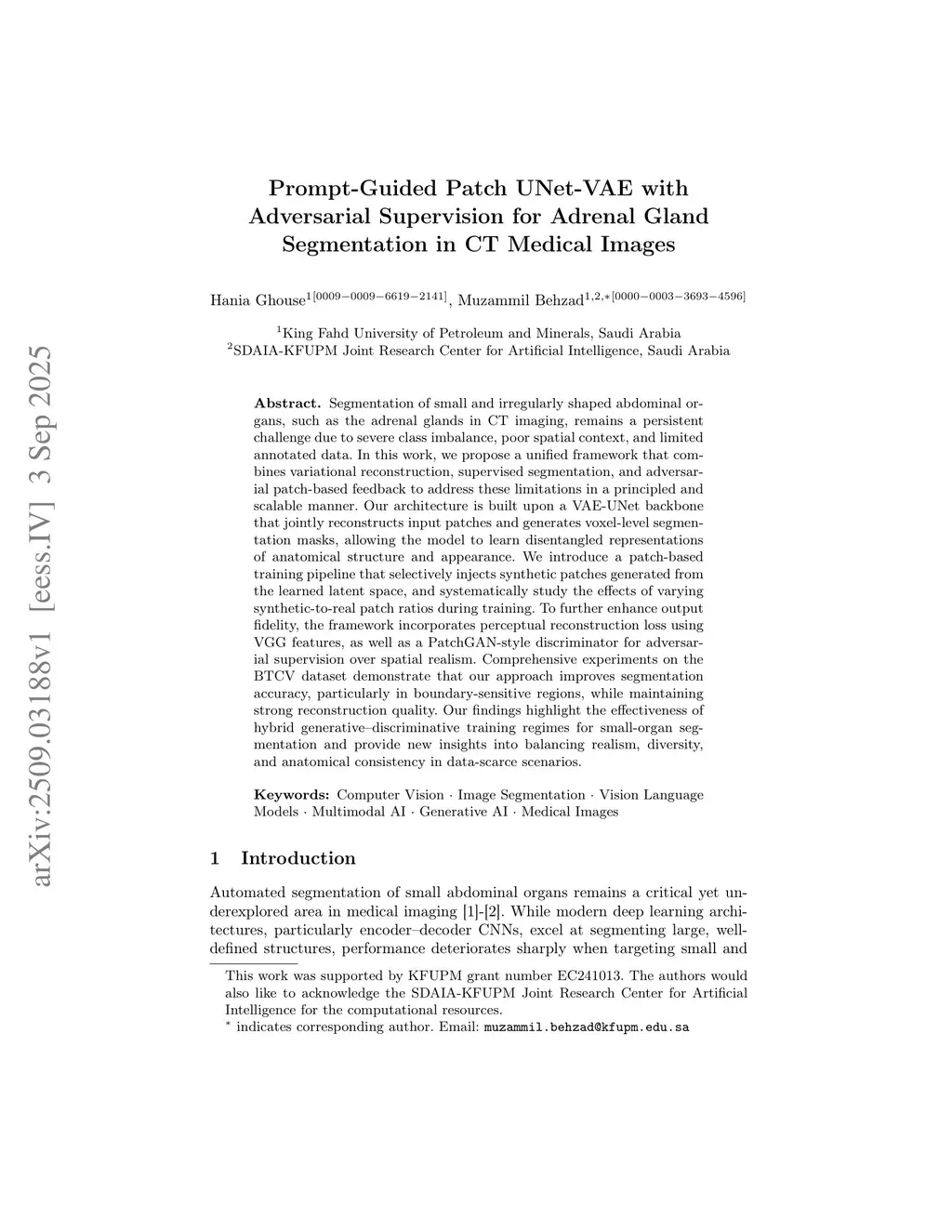 Prompt-Guided Patch UNet-VAE with Adversarial Supervision for Adrenal Gland Segmentation in Computed Tomography Medical Images