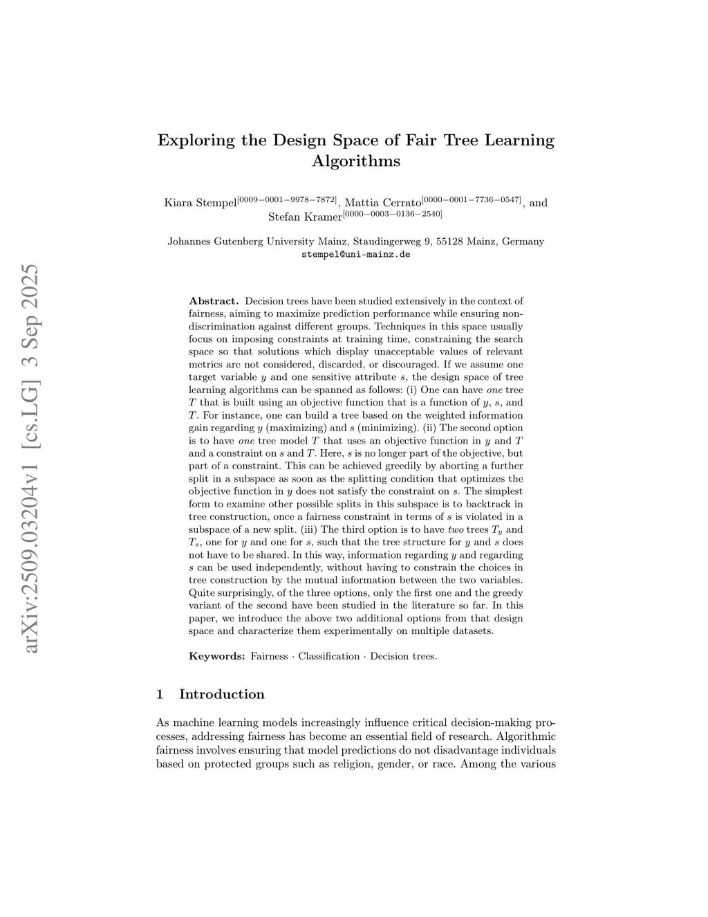 Decision trees have been studied extensively in the context of fairness, aiming to maximize prediction performance while ensuring non-discrimination against different groups. Techniques in this space usually focus on imposing constraints at training time, constraining the search space so that solutions which display unacceptable values of relevant metrics are not considered, discarded, or discouraged. If we assume one target variable y and one sensitive attribute s, the design space of tree learning algorithms can be spanned as follows: (i) One can have one tree T that is built using an objective function that is a function of y, s, and T. For instance, one can build a tree based on the weighted information gain regarding y (maximizing) and s (minimizing). (ii) The second option is to have one tree model T that uses an objective function in y and T and a constraint on s and T. Here, s is no longer part of the objective, but part of a constraint. This can be achieved greedily by aborting a further split as soon as the condition that optimizes the objective in y fails to satisfy the constraint on s. A simple way to explore other splits is to backtrack during tree construction once a fairness constraint is violated. (iii) The third option is to have two trees T_y and T_s, one for y and one for s, such that the tree structure for y and s does not have to be shared. In this way, information regarding y and regarding s can be used independently, without having to constrain the choices in tree construction by the mutual information between the two variables. Quite surprisingly, of the three options, only the first one and the greedy variant of the second have been studied in the literature so far. In this paper, we introduce the above two additional options from that design space and characterize them experimentally on multiple datasets.