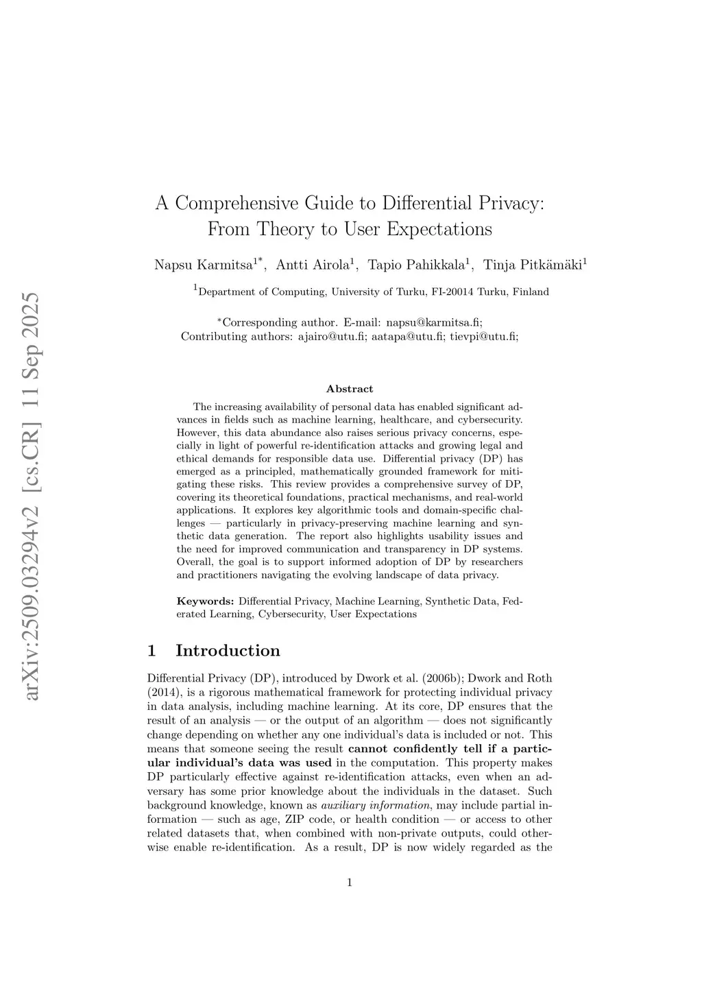 The increasing availability of personal data has enabled significant advances in fields such as machine learning, healthcare, and cybersecurity. However, this data abundance also raises serious privacy concerns, especially in light of powerful re-identification attacks and growing legal and ethical demands for responsible data use. Differential privacy (DP) has emerged as a principled, mathematically grounded framework for mitigating these risks. This review provides a comprehensive survey of DP, covering its theoretical foundations, practical mechanisms, and real-world applications. It explores key algorithmic tools and domain-specific challenges - particularly in privacy-preserving machine learning and synthetic data generation. The report also highlights usability issues and the need for improved communication and transparency in DP systems. Overall, the goal is to support informed adoption of DP by researchers and practitioners navigating the evolving landscape of data privacy.