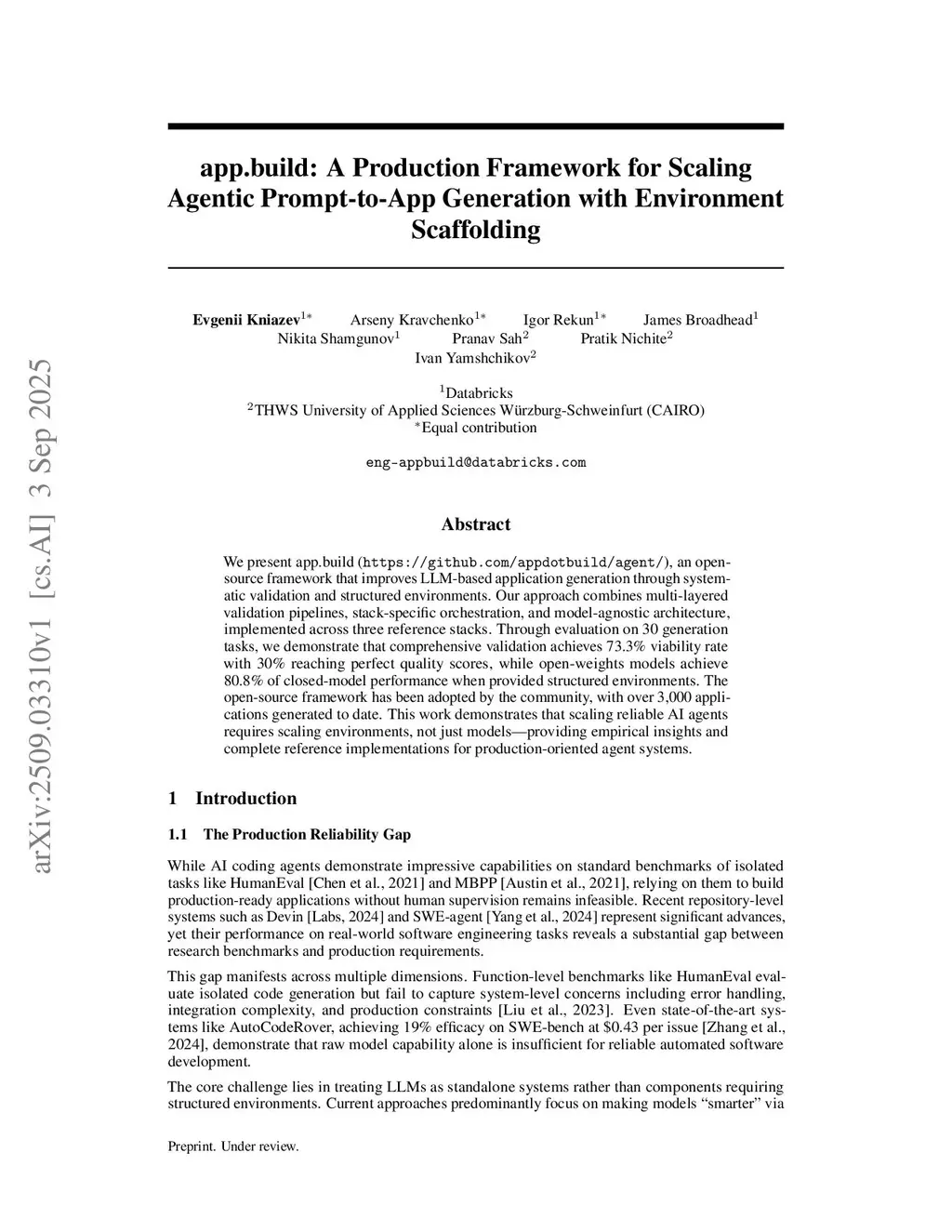 We presentthis http URL(this https URL), an open-source framework that improves LLM-based application generation through systematic validation and structured environments. Our approach combines multi-layered validation pipelines, stack-specific orchestration, and model-agnostic architecture, implemented across three reference stacks. Through evaluation on 30 generation tasks, we demonstrate that comprehensive validation achieves 73.3% viability rate with 30% reaching perfect quality scores, while open-weights models achieve 80.8% of closed-model performance when provided structured environments. The open-source framework has been adopted by the community, with over 3,000 applications generated to date. This work demonstrates that scaling reliable AI agents requires scaling environments, not just models -- providing empirical insights and complete reference implementations for production-oriented agent systems.
