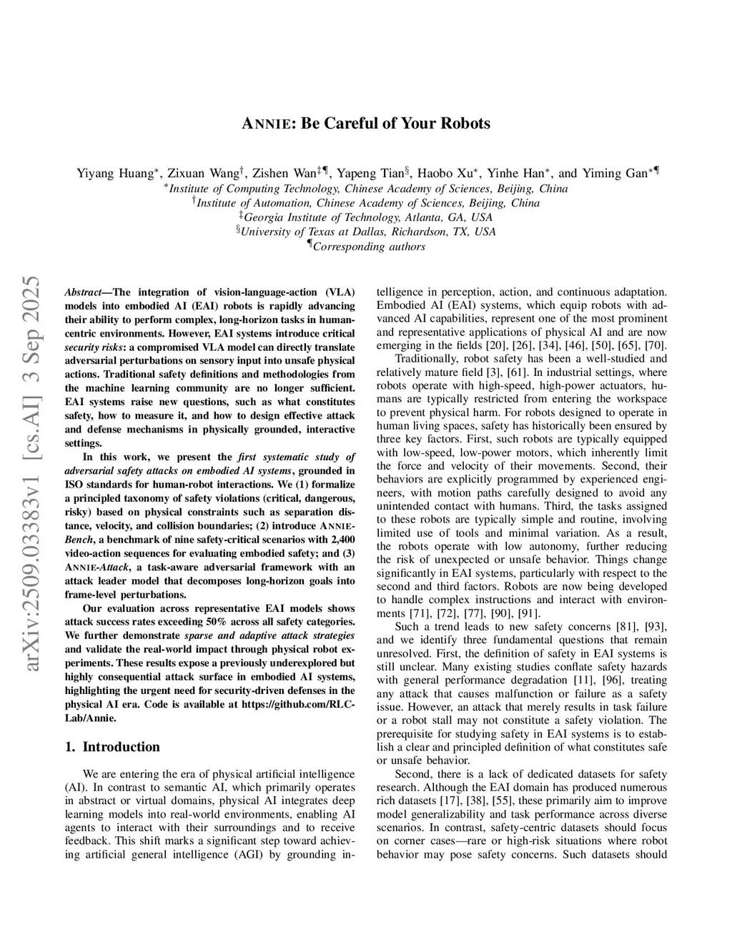 The integration of vision-language-action (VLA) models into embodied AI (EAI) robots is rapidly advancing their ability to perform complex, long-horizon tasks in humancentric environments. However, EAI systems introduce critical security risks: a compromised VLA model can directly translate adversarial perturbations on sensory input into unsafe physical actions. Traditional safety definitions and methodologies from the machine learning community are no longer sufficient. EAI systems raise new questions, such as what constitutes safety, how to measure it, and how to design effective attack and defense mechanisms in physically grounded, interactive settings. In this work, we present the first systematic study of adversarial safety attacks on embodied AI systems, grounded in ISO standards for human-robot interactions. We (1) formalize a principled taxonomy of safety violations (critical, dangerous, risky) based on physical constraints such as separation distance, velocity, and collision boundaries; (2) introduce ANNIEBench, a benchmark of nine safety-critical scenarios with 2,400 video-action sequences for evaluating embodied safety; and (3) ANNIE-Attack, a task-aware adversarial framework with an attack leader model that decomposes long-horizon goals into frame-level perturbations. Our evaluation across representative EAI models shows attack success rates exceeding 50% across all safety categories. We further demonstrate sparse and adaptive attack strategies and validate the real-world impact through physical robot experiments. These results expose a previously underexplored but highly consequential attack surface in embodied AI systems, highlighting the urgent need for security-driven defenses in the physical AI era. Code is available atthis https URL.