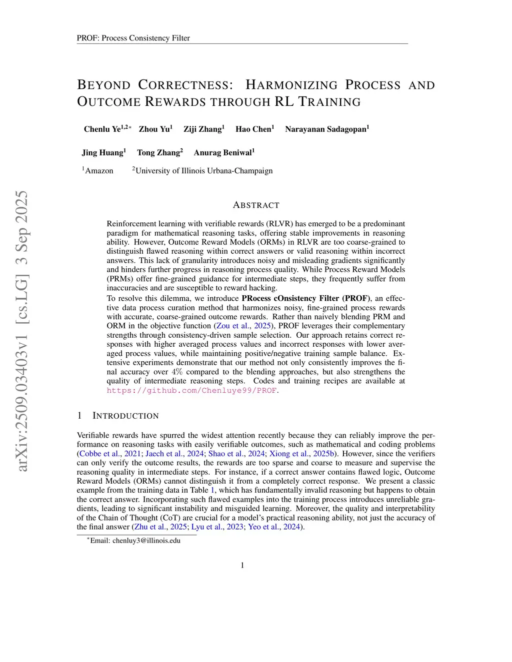 Reinforcement learning with verifiable rewards (RLVR) has emerged to be a predominant paradigm for mathematical reasoning tasks, offering stable improvements in reasoning ability. However, Outcome Reward Models (ORMs) in RLVR are too coarse-grained to distinguish flawed reasoning within correct answers or valid reasoning within incorrect answers. This lack of granularity introduces noisy and misleading gradients significantly and hinders further progress in reasoning process quality. While Process Reward Models (PRMs) offer fine-grained guidance for intermediate steps, they frequently suffer from inaccuracies and are susceptible to reward hacking.To resolve this dilemma, we introduce PRocess cOnsistency Filter (PROF), an effective data process curation method that harmonizes noisy, fine-grained process rewards with accurate, coarse-grained outcome rewards. Rather than naively blending PRM and ORM in the objective function (arXiv:archive/2506.18896), PROF leverages their complementary strengths through consistency-driven sample selection. Our approach retains correct responses with higher averaged process values and incorrect responses with lower averaged process values, while maintaining positive/negative training sample balance. Extensive experiments demonstrate that our method not only consistently improves the final accuracy over compared to the blending approaches, but also strengthens the quality of intermediate reasoning steps. Codes and training recipes are available atthis https URL.