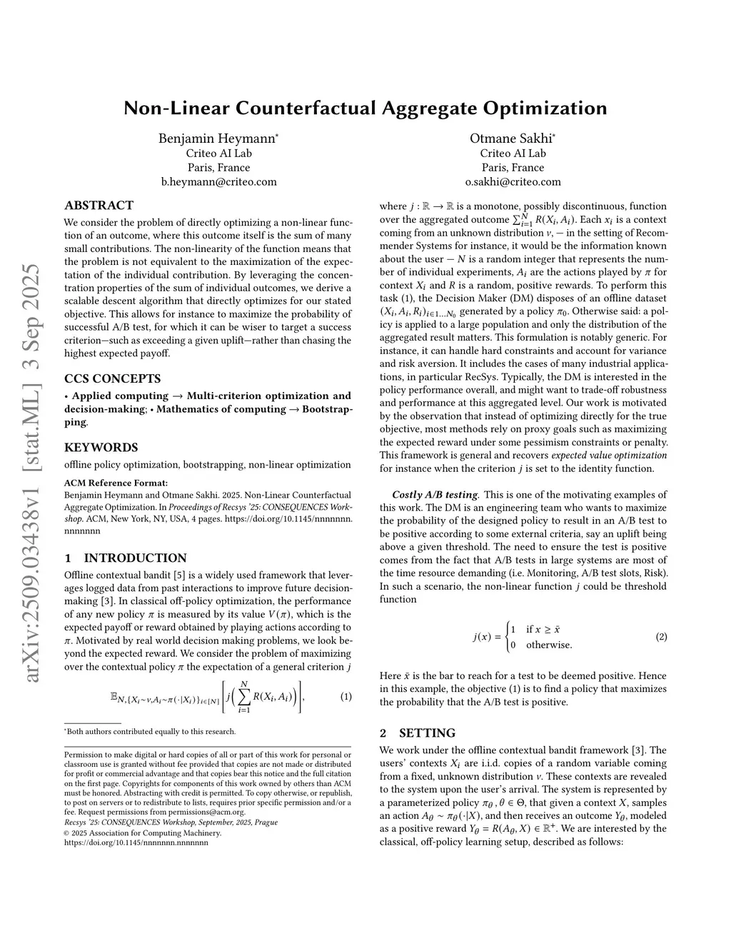 We consider the problem of directly optimizing a non-linear function of an outcome, where this outcome itself is the sum of many small contributions. The non-linearity of the function means that the problem is not equivalent to the maximization of the expectation of the individual contribution. By leveraging the concentration properties of the sum of individual outcomes, we derive a scalable descent algorithm that directly optimizes for our stated objective. This allows for instance to maximize the probability of successful A/B test, for which it can be wiser to target a success criterion, such as exceeding a given uplift, rather than chasing the highest expected payoff.