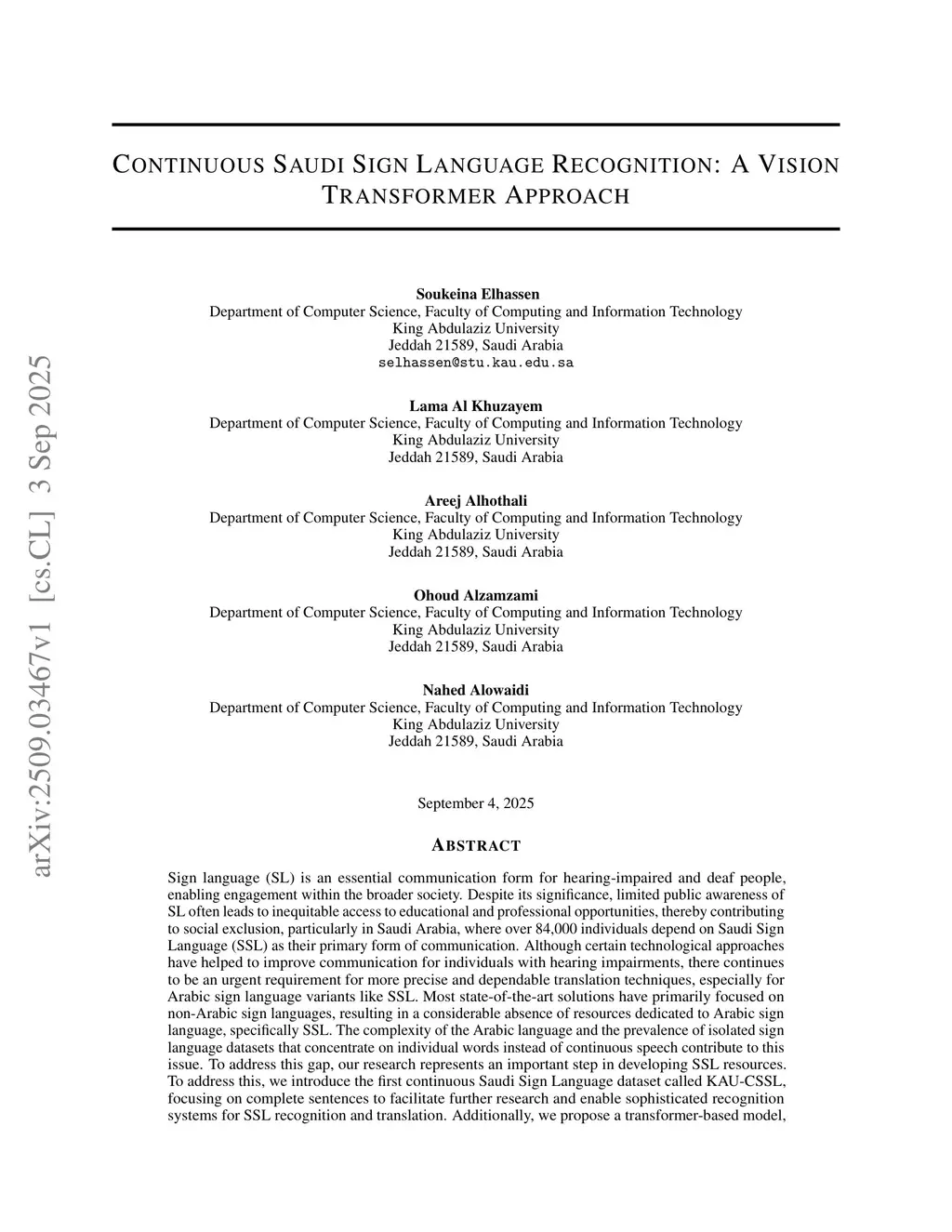 Continuous Saudi Sign Language Recognition: A Vision Transformer Approach