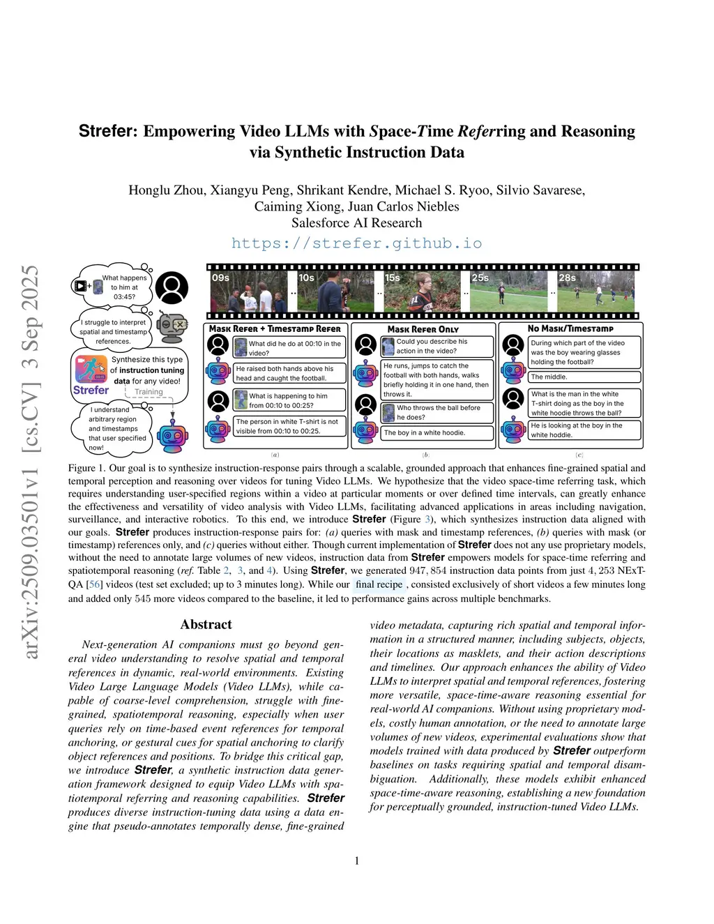 Next-generation AI companions must go beyond general video understanding to resolve spatial and temporal references in dynamic, real-world environments. Existing Video Large Language Models (Video LLMs), while capable of coarse-level comprehension, struggle with fine-grained, spatiotemporal reasoning, especially when user queries rely on time-based event references for temporal anchoring, or gestural cues for spatial anchoring to clarify object references and positions. To bridge this critical gap, we introduce Strefer, a synthetic instruction data generation framework designed to equip Video LLMs with spatiotemporal referring and reasoning capabilities. Strefer produces diverse instruction-tuning data using a data engine that pseudo-annotates temporally dense, fine-grained video metadata, capturing rich spatial and temporal information in a structured manner, including subjects, objects, their locations as masklets, and their action descriptions and timelines. Our approach enhances the ability of Video LLMs to interpret spatial and temporal references, fostering more versatile, space-time-aware reasoning essential for real-world AI companions. Without using proprietary models, costly human annotation, or the need to annotate large volumes of new videos, experimental evaluations show that models trained with data produced by Strefer outperform baselines on tasks requiring spatial and temporal disambiguation. Additionally, these models exhibit enhanced space-time-aware reasoning, establishing a new foundation for perceptually grounded, instruction-tuned Video LLMs.