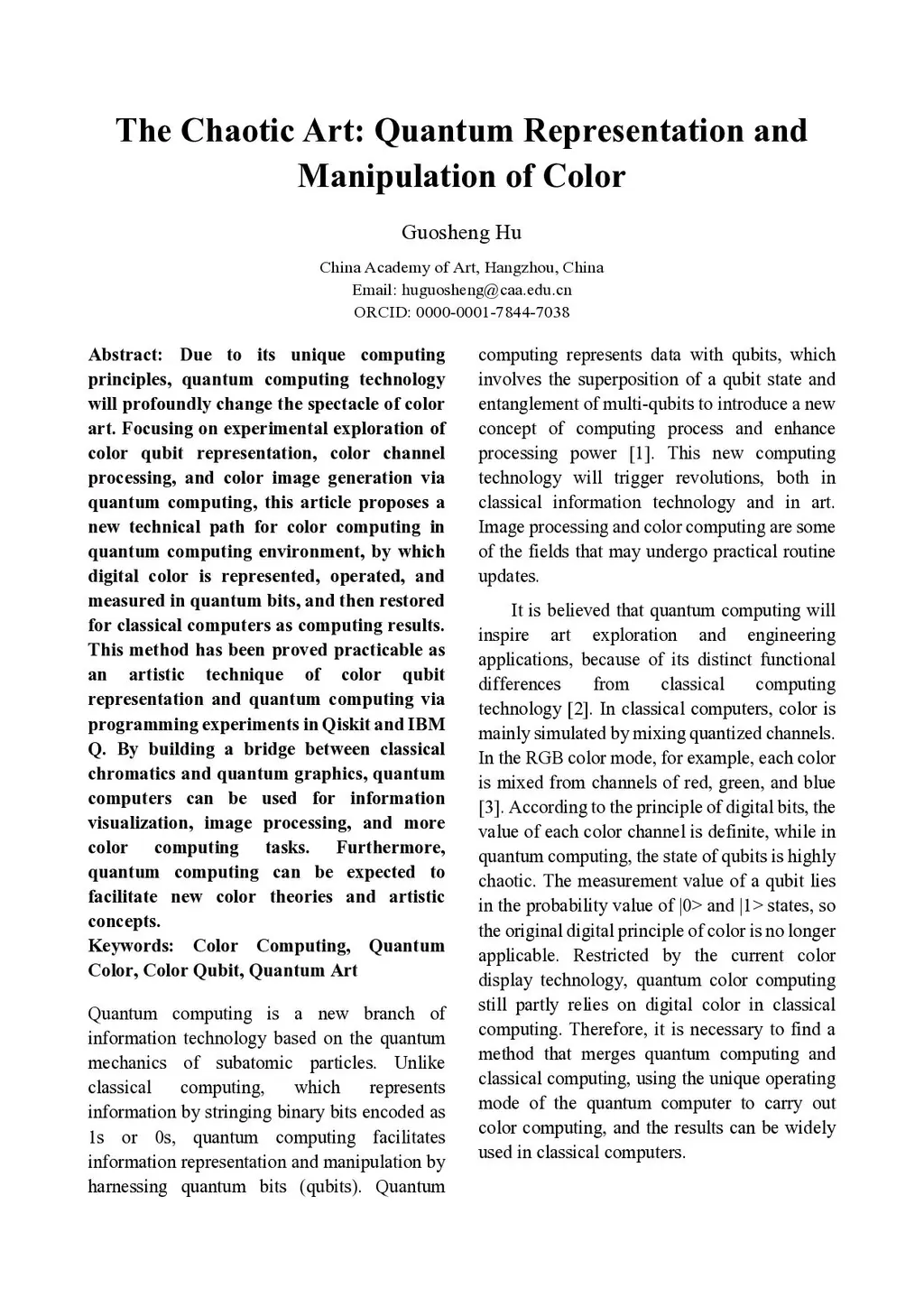 Due to its unique computing principles, quantum computing technology will profoundly change the spectacle of color art. Focusing on experimental exploration of color qubit representation, color channel processing, and color image generation via quantum computing, this article proposes a new technical path for color computing in quantum computing environment, by which digital color is represented, operated, and measured in quantum bits, and then restored for classical computers as computing results. This method has been proved practicable as an artistic technique of color qubit representation and quantum computing via programming experiments in Qiskit and IBM Q. By building a bridge between classical chromatics and quantum graphics, quantum computers can be used for information visualization, image processing, and more color computing tasks. Furthermore, quantum computing can be expected to facilitate new color theories and artistic concepts.