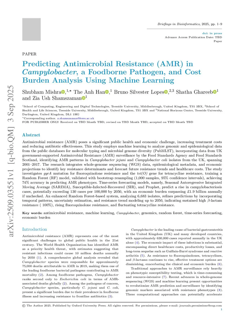 Antimicrobial resistance (AMR) poses a significant public health and economic challenge, increasing treatment costs and reducing antibiotic effectiveness. This study employs machine learning to analyze genomic and epidemiological data from the public databases for molecular typing and microbial genome diversity (PubMLST), incorporating data from UK government-supported AMR surveillance by the Food Standards Agency and Food Standards Scotland. We identify AMR patterns in Campylobacter jejuni and Campylobacter coli isolates collected in the UK from 2001 to 2017. The research integrates whole-genome sequencing (WGS) data, epidemiological metadata, and economic projections to identify key resistance determinants and forecast future resistance trends and healthcare costs. We investigate gyrA mutations for fluoroquinolone resistance and the tet(O) gene for tetracycline resistance, training a Random Forest model validated with bootstrap resampling (1,000 samples, 95% confidence intervals), achieving 74% accuracy in predicting AMR phenotypes. Time-series forecasting models (SARIMA, SIR, and Prophet) predict a rise in campylobacteriosis cases, potentially exceeding 130 cases per 100,000 people by 2050, with an economic burden projected to surpass 1.9 billion GBP annually if left unchecked. An enhanced Random Forest system, analyzing 6,683 isolates, refines predictions by incorporating temporal patterns, uncertainty estimation, and resistance trend modeling, indicating sustained high beta-lactam resistance, increasing fluoroquinolone resistance, and fluctuating tetracycline resistance.