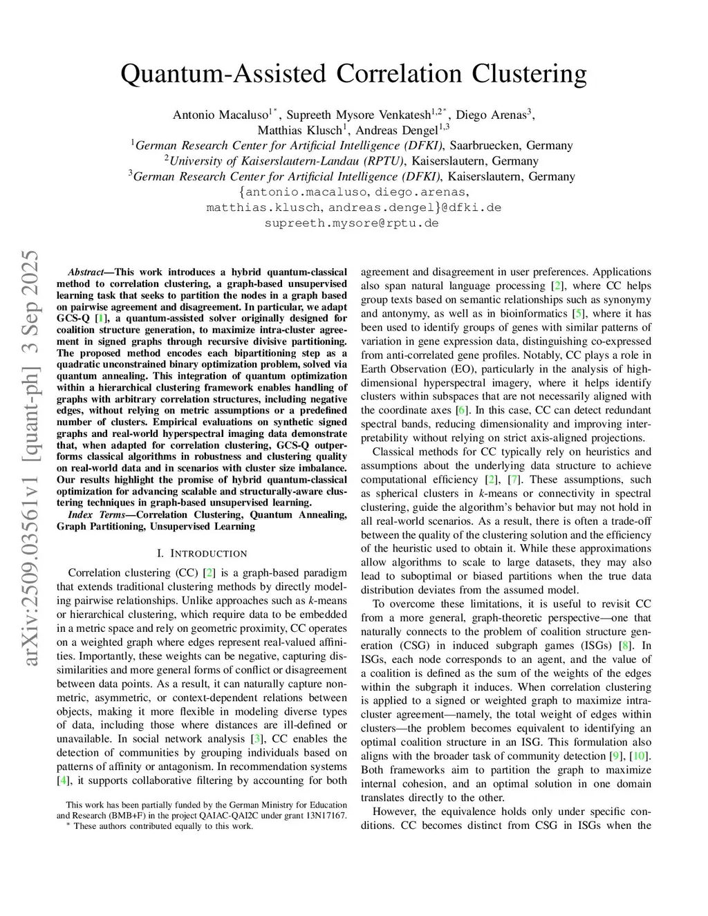 This work introduces a hybrid quantum-classical method to correlation clustering, a graph-based unsupervised learning task that seeks to partition the nodes in a graph based on pairwise agreement and disagreement. In particular, we adapt GCS-Q, a quantum-assisted solver originally designed for coalition structure generation, to maximize intra-cluster agreement in signed graphs through recursive divisive partitioning. The proposed method encodes each bipartitioning step as a quadratic unconstrained binary optimization problem, solved via quantum annealing. This integration of quantum optimization within a hierarchical clustering framework enables handling of graphs with arbitrary correlation structures, including negative edges, without relying on metric assumptions or a predefined number of clusters. Empirical evaluations on synthetic signed graphs and real-world hyperspectral imaging data demonstrate that, when adapted for correlation clustering, GCS-Q outperforms classical algorithms in robustness and clustering quality on real-world data and in scenarios with cluster size imbalance. Our results highlight the promise of hybrid quantum-classical optimization for advancing scalable and structurally-aware clustering techniques in graph-based unsupervised learning.
