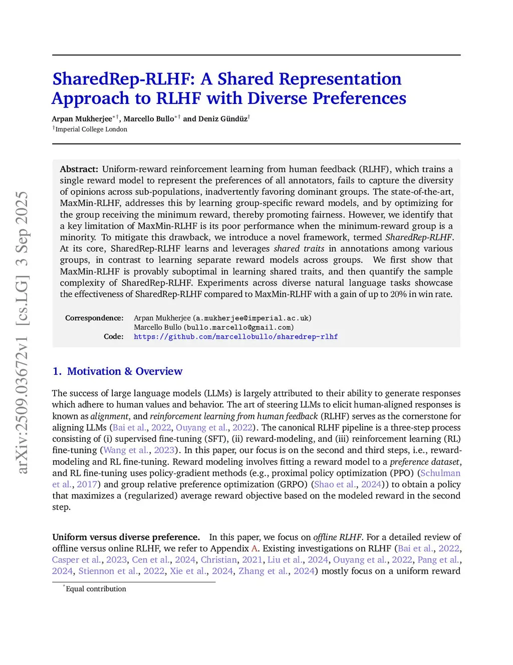Uniform-reward reinforcement learning from human feedback (RLHF), which trains a single reward model to represent the preferences of all annotators, fails to capture the diversity of opinions across sub-populations, inadvertently favoring dominant groups. The state-of-the-art, MaxMin-RLHF, addresses this by learning group-specific reward models, and by optimizing for the group receiving the minimum reward, thereby promoting fairness. However, we identify that a key limitation of MaxMin-RLHF is its poor performance when the minimum-reward group is a minority. To mitigate this drawback, we introduce a novel framework, termed {\em SharedRep-RLHF}. At its core, SharedRep-RLHF learns and leverages {\em shared traits} in annotations among various groups, in contrast to learning separate reward models across groups. We first show that MaxMin-RLHF is provably suboptimal in learning shared traits, and then quantify the sample complexity of SharedRep-RLHF. Experiments across diverse natural language tasks showcase the effectiveness of SharedRep-RLHF compared to MaxMin-RLHF with a gain of up to 20% in win rate.