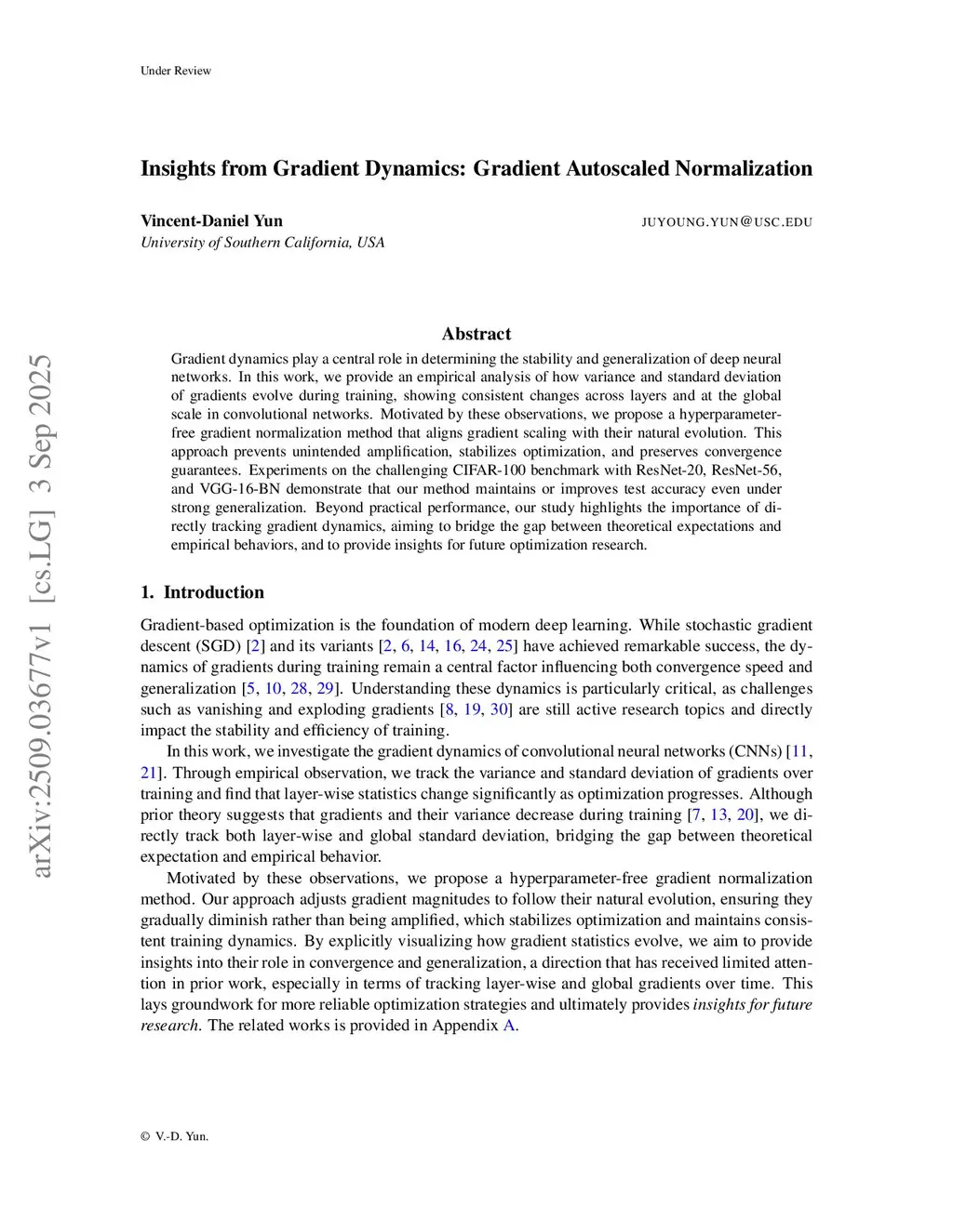 Gradient dynamics play a central role in determining the stability and generalization of deep neural networks. In this work, we provide an empirical analysis of how variance and standard deviation of gradients evolve during training, showing consistent changes across layers and at the global scale in convolutional networks. Motivated by these observations, we propose a hyperparameter-free gradient normalization method that aligns gradient scaling with their natural evolution. This approach prevents unintended amplification, stabilizes optimization, and preserves convergence guarantees. Experiments on the challenging CIFAR-100 benchmark with ResNet-20, ResNet-56, and VGG-16-BN demonstrate that our method maintains or improves test accuracy even under strong generalization. Beyond practical performance, our study highlights the importance of directly tracking gradient dynamics, aiming to bridge the gap between theoretical expectations and empirical behaviors, and to provide insights for future optimization research.
