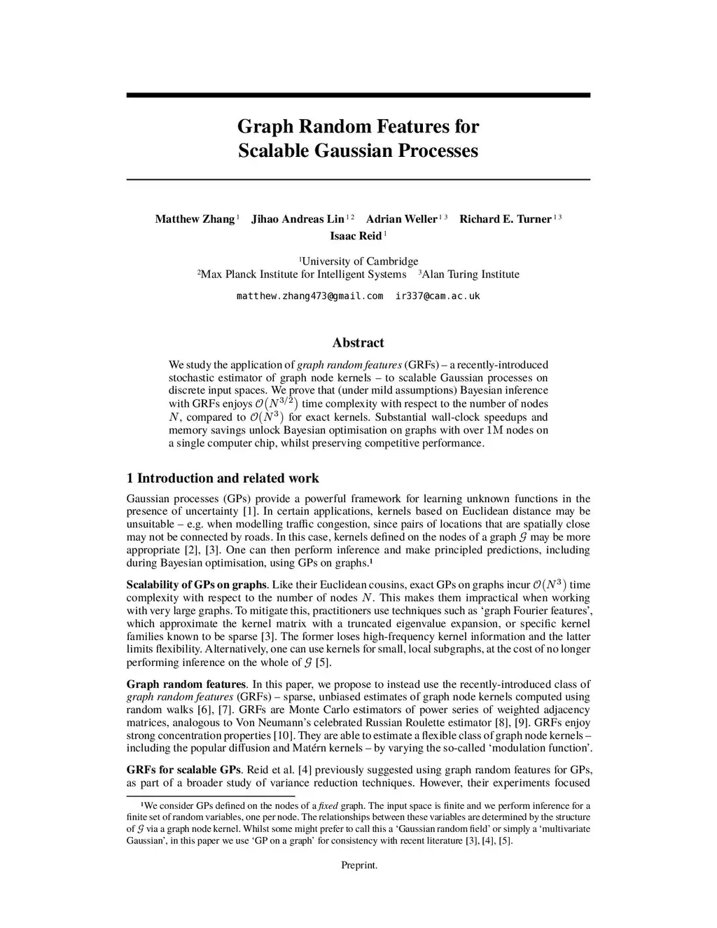 We study the application of graph random features (GRFs) - a recently introduced stochastic estimator of graph node kernels - to scalable Gaussian processes on discrete input spaces. We prove that (under mild assumptions) Bayesian inference with GRFs enjoys time complexity with respect to the number of nodes , compared to for exact kernels. Substantial wall-clock speedups and memory savings unlock Bayesian optimisation on graphs with over nodes on a single computer chip, whilst preserving competitive performance.
