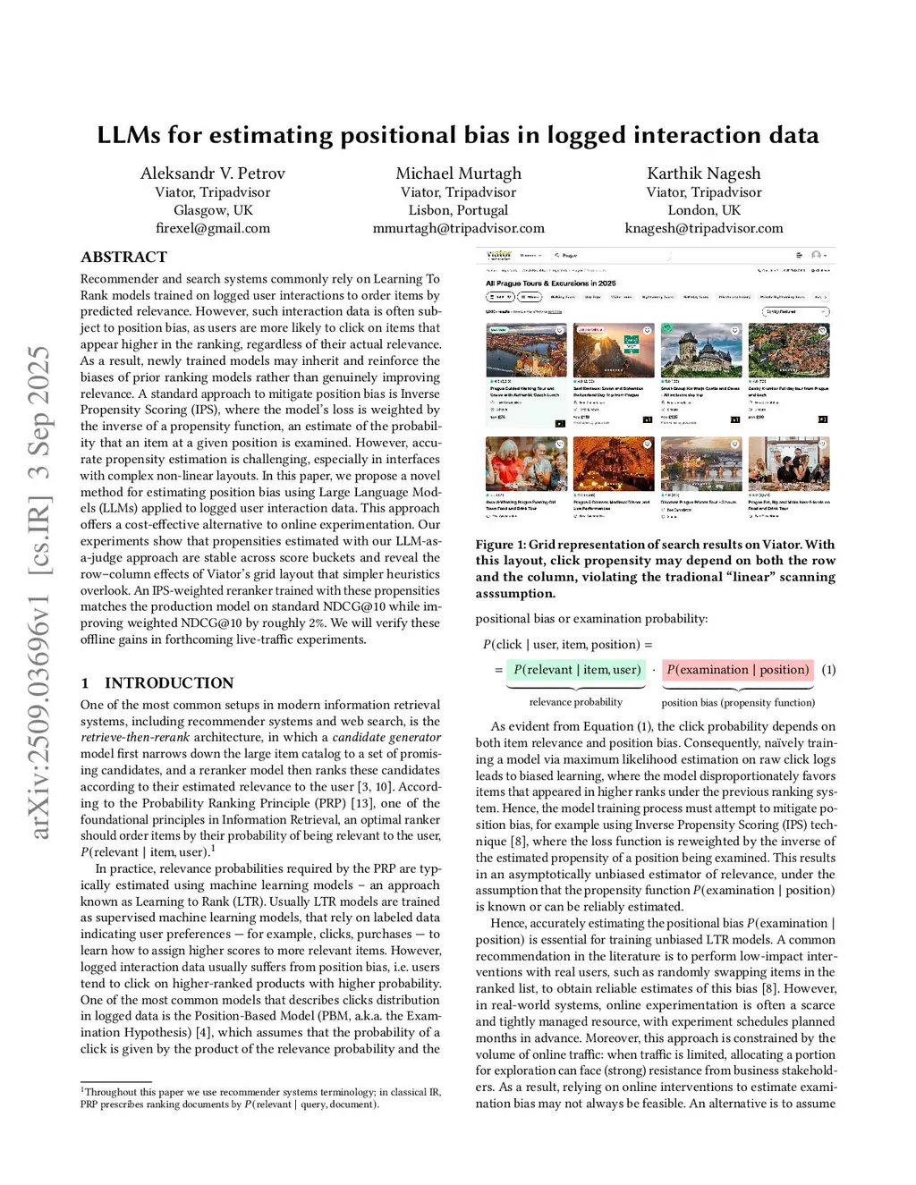 Recommender and search systems commonly rely on Learning To Rank models trained on logged user interactions to order items by predicted relevance. However, such interaction data is often subject to position bias, as users are more likely to click on items that appear higher in the ranking, regardless of their actual relevance. As a result, newly trained models may inherit and reinforce the biases of prior ranking models rather than genuinely improving relevance. A standard approach to mitigate position bias is Inverse Propensity Scoring (IPS), where the model's loss is weighted by the inverse of a propensity function, an estimate of the probability that an item at a given position is examined. However, accurate propensity estimation is challenging, especially in interfaces with complex non-linear layouts. In this paper, we propose a novel method for estimating position bias using Large Language Models (LLMs) applied to logged user interaction data. This approach offers a cost-effective alternative to online experimentation. Our experiments show that propensities estimated with our LLM-as-a-judge approach are stable across score buckets and reveal the row-column effects of Viator's grid layout that simpler heuristics overlook. An IPS-weighted reranker trained with these propensities matches the production model on standard NDCG@10 while improving weighted NDCG@10 by roughly 2%. We will verify these offline gains in forthcoming live-traffic experiments.
