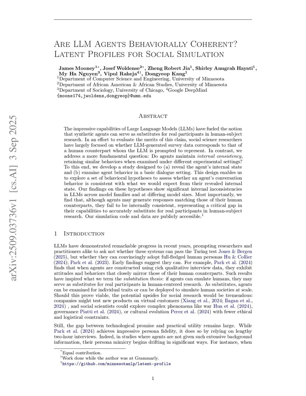 The impressive capabilities of Large Language Models (LLMs) have fueled the notion that synthetic agents can serve as substitutes for real participants in human-subject research. In an effort to evaluate the merits of this claim, social science researchers have largely focused on whether LLM-generated survey data corresponds to that of a human counterpart whom the LLM is prompted to represent. In contrast, we address a more fundamental question: Do agents maintain internal consistency, retaining similar behaviors when examined under different experimental settings? To this end, we develop a study designed to (a) reveal the agent's internal state and (b) examine agent behavior in a basic dialogue setting. This design enables us to explore a set of behavioral hypotheses to assess whether an agent's conversation behavior is consistent with what we would expect from their revealed internal state. Our findings on these hypotheses show significant internal inconsistencies in LLMs across model families and at differing model sizes. Most importantly, we find that, although agents may generate responses matching those of their human counterparts, they fail to be internally consistent, representing a critical gap in their capabilities to accurately substitute for real participants in human-subject research. Our simulation code and data are publicly accessible.