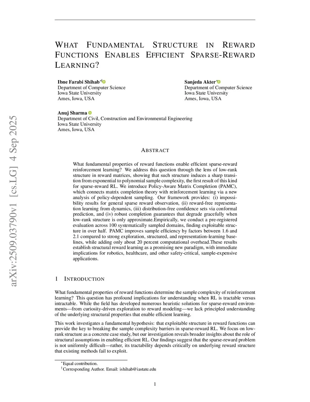 What fundamental properties of reward functions enable efficient sparse-reward reinforcement learning? We address this question through the lens of low-rank structure in reward matrices, showing that such structure induces a sharp transition from exponential to polynomial sample complexity, the first result of this kind for sparse-reward RL. We introduce Policy-Aware Matrix Completion (PAMC), which connects matrix completion theory with reinforcement learning via a new analysis of policy-dependent sampling. Our framework provides: (i) impossibility results for general sparse reward observation, (ii) reward-free representation learning from dynamics, (iii) distribution-free confidence sets via conformal prediction, and (iv) robust completion guarantees that degrade gracefully when low-rank structure is only approximate. Empirically, we conduct a pre-registered evaluation across 100 systematically sampled domains, finding exploitable structure in over half. PAMC improves sample efficiency by factors between 1.6 and 2.1 compared to strong exploration, structured, and representation-learning baselines, while adding only about 20 percent computational this http URL results establish structural reward learning as a promising new paradigm, with immediate implications for robotics, healthcare, and other safety-critical, sample-expensive applications.
