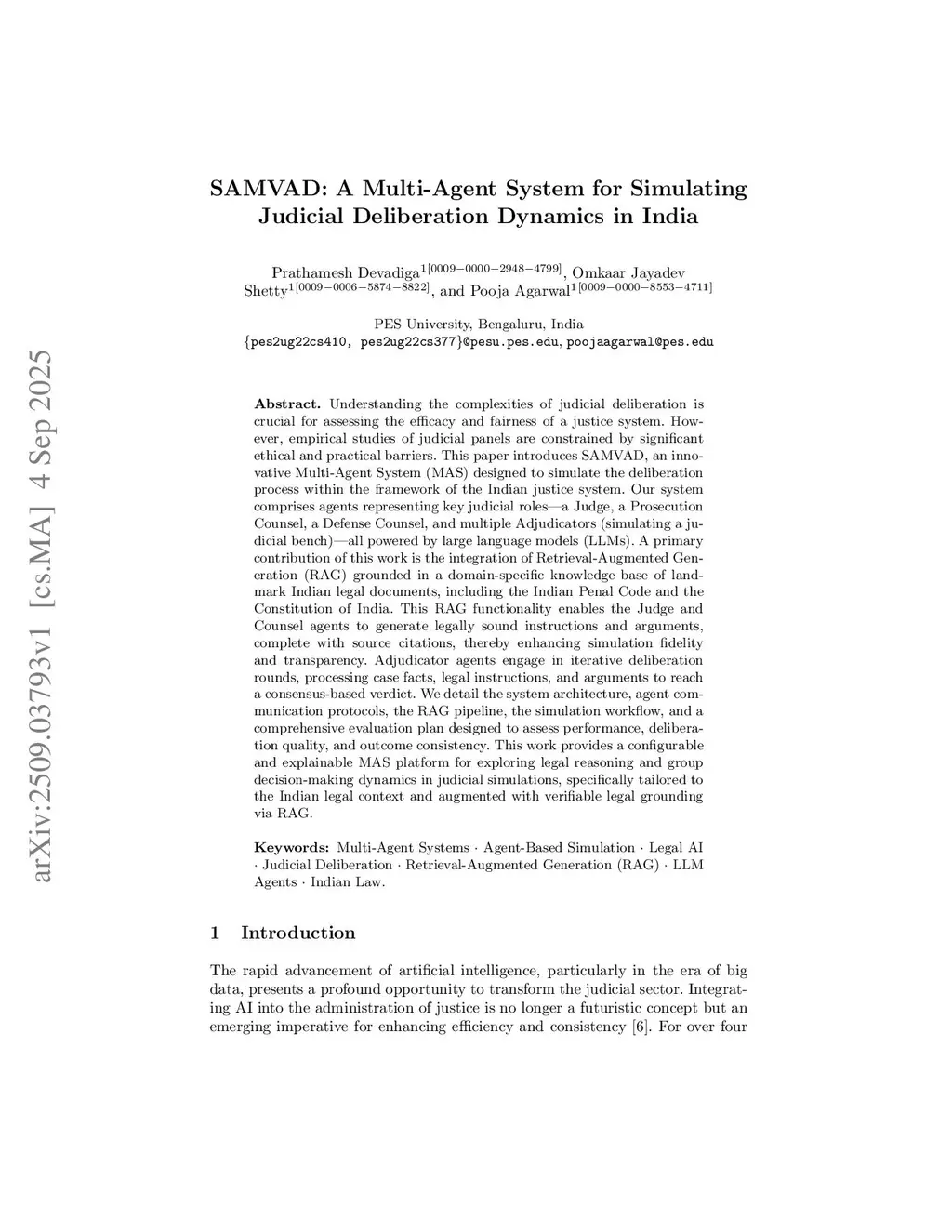 Understanding the complexities of judicial deliberation is crucial for assessing the efficacy and fairness of a justice system. However, empirical studies of judicial panels are constrained by significant ethical and practical barriers. This paper introduces SAMVAD, an innovative Multi-Agent System (MAS) designed to simulate the deliberation process within the framework of the Indian justice system.Our system comprises agents representing key judicial roles: a Judge, a Prosecution Counsel, a Defense Counsel, and multiple Adjudicators (simulating a judicial bench), all powered by large language models (LLMs). A primary contribution of this work is the integration of Retrieval-Augmented Generation (RAG), grounded in a domain-specific knowledge base of landmark Indian legal documents, including the Indian Penal Code and the Constitution of India. This RAG functionality enables the Judge and Counsel agents to generate legally sound instructions and arguments, complete with source citations, thereby enhancing both the fidelity and transparency of the simulation.The Adjudicator agents engage in iterative deliberation rounds, processing case facts, legal instructions, and arguments to reach a consensus-based verdict. We detail the system architecture, agent communication protocols, the RAG pipeline, the simulation workflow, and a comprehensive evaluation plan designed to assess performance, deliberation quality, and outcome consistency.This work provides a configurable and explainable MAS platform for exploring legal reasoning and group decision-making dynamics in judicial simulations, specifically tailored to the Indian legal context and augmented with verifiable legal grounding via RAG.