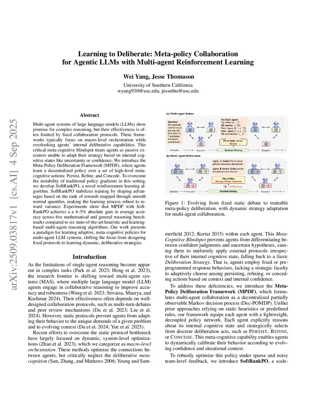 Multi-agent systems of large language models (LLMs) show promise for complex reasoning, but their effectiveness is often limited by fixed collaboration protocols. These frameworks typically focus on macro-level orchestration while overlooking agents' internal deliberative capabilities. This critical meta-cognitive blindspot treats agents as passive executors unable to adapt their strategy based on internal cognitive states like uncertainty or confidence. We introduce the Meta-Policy Deliberation Framework (MPDF), where agents learn a decentralized policy over a set of high-level meta-cognitive actions: Persist, Refine, and Concede. To overcome the instability of traditional policy gradients in this setting, we develop SoftRankPO, a novel reinforcement learning algorithm. SoftRankPO stabilizes training by shaping advantages based on the rank of rewards mapped through smooth normal quantiles, making the learning process robust to reward variance. Experiments show that MPDF with SoftRankPO achieves a a 4-5% absolute gain in average accuracy across five mathematical and general reasoning benchmarks compared to six state-of-the-art heuristic and learning-based multi-agent reasoning algorithms. Our work presents a paradigm for learning adaptive, meta-cognitive policies for multi-agent LLM systems, shifting the focus from designing fixed protocols to learning dynamic, deliberative strategies.
