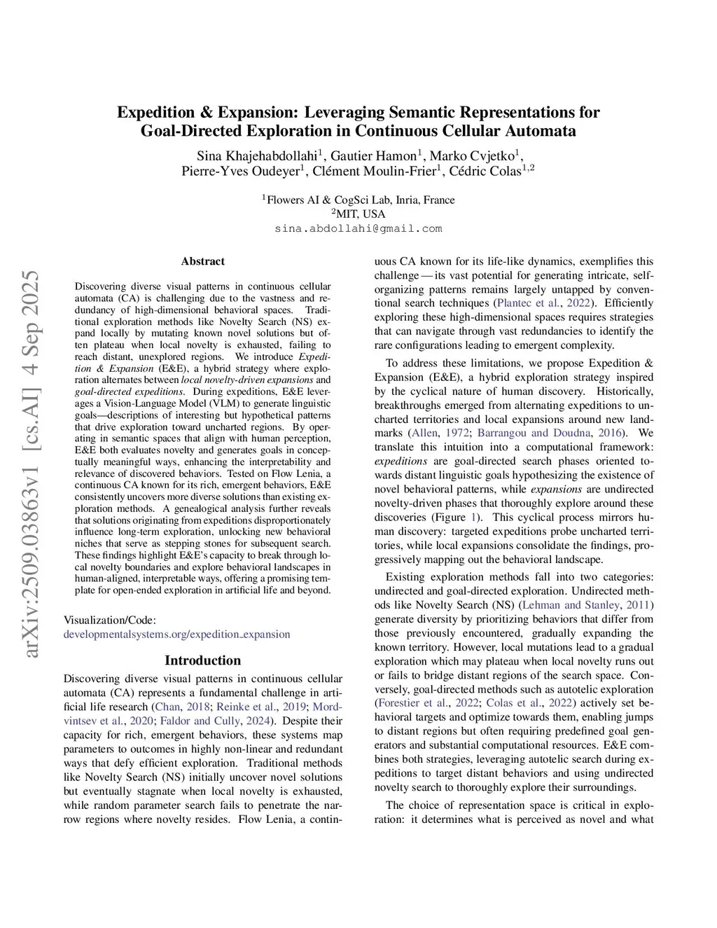 Discovering diverse visual patterns in continuous cellular automata (CA) is challenging due to the vastness and redundancy of high-dimensional behavioral spaces. Traditional exploration methods like Novelty Search (NS) expand locally by mutating known novel solutions but often plateau when local novelty is exhausted, failing to reach distant, unexplored regions. We introduce Expedition and Expansion (E&E), a hybrid strategy where exploration alternates between local novelty-driven expansions and goal-directed expeditions. During expeditions, E&E leverages a Vision-Language Model (VLM) to generate linguistic goals--descriptions of interesting but hypothetical patterns that drive exploration toward uncharted regions. By operating in semantic spaces that align with human perception, E&E both evaluates novelty and generates goals in conceptually meaningful ways, enhancing the interpretability and relevance of discovered behaviors. Tested on Flow Lenia, a continuous CA known for its rich, emergent behaviors, E&E consistently uncovers more diverse solutions than existing exploration methods. A genealogical analysis further reveals that solutions originating from expeditions disproportionately influence long-term exploration, unlocking new behavioral niches that serve as stepping stones for subsequent search. These findings highlight E&E's capacity to break through local novelty boundaries and explore behavioral landscapes in human-aligned, interpretable ways, offering a promising template for open-ended exploration in artificial life and beyond.