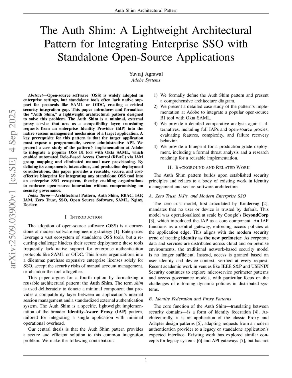 Open-source software OSS is widely adopted in enterprise settings, but standalone tools often lack native support for protocols like SAML or OIDC, creating a critical security integration gap. This paper introduces and formalizes the Auth Shim, a lightweight architectural pattern designed to solve this problem. The Auth Shim is a minimal, external proxy service that acts as a compatibility layer, translating requests from an enterprise Identity Provider IdP into the native session management mechanism of a target application. A key prerequisite for this pattern is that the target application must expose a programmatic, secure administrative API. We present a case study of the pattern's implementation at Adobe to integrate a popular OSS BI tool with Okta SAML, which enabled automated Role-Based Access Control RBAC via IAM group mapping and eliminated manual user provisioning. By defining its components, interactions, and production deployment considerations, this paper provides a reusable, secure, and cost-effective blueprint for integrating any standalone OSS tool into an enterprise SSO ecosystem, thereby enabling organizations to embrace open-source innovation without compromising on security governance.
