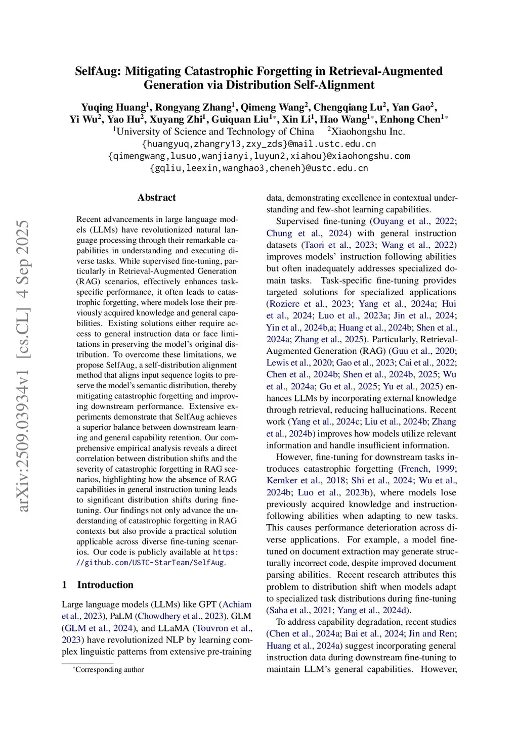 Recent advancements in large language models (LLMs) have revolutionized natural language processing through their remarkable capabilities in understanding and executing diverse tasks. While supervised fine-tuning, particularly in Retrieval-Augmented Generation (RAG) scenarios, effectively enhances task-specific performance, it often leads to catastrophic forgetting, where models lose their previously acquired knowledge and general capabilities. Existing solutions either require access to general instruction data or face limitations in preserving the model's original distribution. To overcome these limitations, we propose SelfAug, a self-distribution alignment method that aligns input sequence logits to preserve the model's semantic distribution, thereby mitigating catastrophic forgetting and improving downstream performance. Extensive experiments demonstrate that SelfAug achieves a superior balance between downstream learning and general capability retention. Our comprehensive empirical analysis reveals a direct correlation between distribution shifts and the severity of catastrophic forgetting in RAG scenarios, highlighting how the absence of RAG capabilities in general instruction tuning leads to significant distribution shifts during fine-tuning. Our findings not only advance the understanding of catastrophic forgetting in RAG contexts but also provide a practical solution applicable across diverse fine-tuning scenarios. Our code is publicly available atthis https URL.