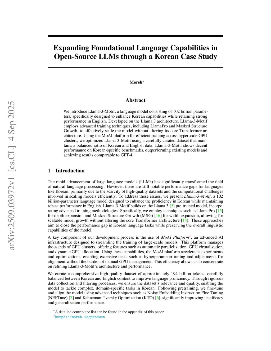 We introduce Llama-3-Motif, a language model consisting of 102 billion parameters, specifically designed to enhance Korean capabilities while retaining strong performance in English. Developed on the Llama 3 architecture, Llama-3-Motif employs advanced training techniques, including LlamaPro and Masked Structure Growth, to effectively scale the model without altering its core Transformer architecture. Using the MoAI platform for efficient training across hyperscale GPU clusters, we optimized Llama-3-Motif using a carefully curated dataset that maintains a balanced ratio of Korean and English data. Llama-3-Motif shows decent performance on Korean-specific benchmarks, outperforming existing models and achieving results comparable to GPT-4.