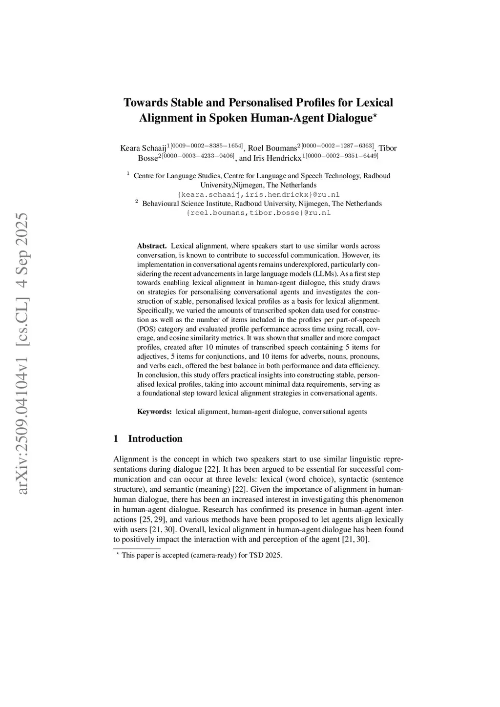 Lexical alignment, where speakers start to use similar words across conversation, is known to contribute to successful communication. However, its implementation in conversational agents remains underexplored, particularly considering the recent advancements in large language models (LLMs). As a first step towards enabling lexical alignment in human-agent dialogue, this study draws on strategies for personalising conversational agents and investigates the construction of stable, personalised lexical profiles as a basis for lexical alignment. Specifically, we varied the amounts of transcribed spoken data used for construction as well as the number of items included in the profiles per part-of-speech (POS) category and evaluated profile performance across time using recall, coverage, and cosine similarity metrics. It was shown that smaller and more compact profiles, created after 10 min of transcribed speech containing 5 items for adjectives, 5 items for conjunctions, and 10 items for adverbs, nouns, pronouns, and verbs each, offered the best balance in both performance and data efficiency. In conclusion, this study offers practical insights into constructing stable, personalised lexical profiles, taking into account minimal data requirements, serving as a foundational step toward lexical alignment strategies in conversational agents.