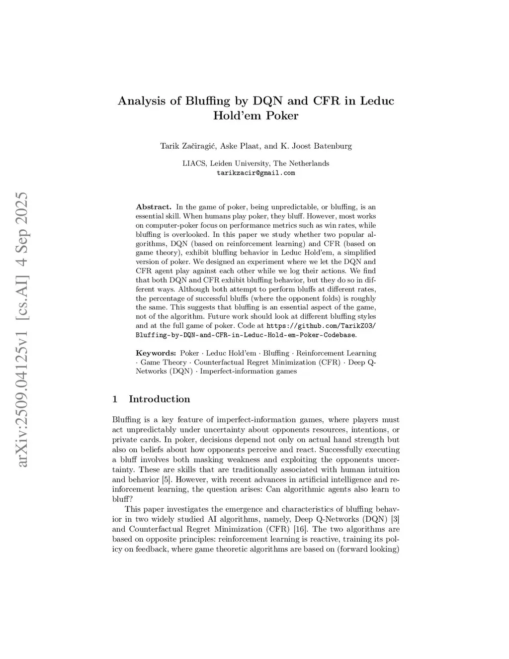In the game of poker, being unpredictable, or bluffing, is an essential skill. When humans play poker, they bluff. However, most works on computer-poker focus on performance metrics such as win rates, while bluffing is overlooked. In this paper we study whether two popular algorithms, DQN (based on reinforcement learning) and CFR (based on game theory), exhibit bluffing behavior in Leduc Holdém, a simplified version of poker. We designed an experiment where we let the DQN and CFR agent play against each other while we log their actions. We find that both DQN and CFR exhibit bluffing behavior, but they do so in different ways. Although both attempt to perform bluffs at different rates, the percentage of successful bluffs (where the opponent folds) is roughly the same. This suggests that bluffing is an essential aspect of the game, not of the algorithm. Future work should look at different bluffing styles and at the full game of poker. Code atthis https URL.