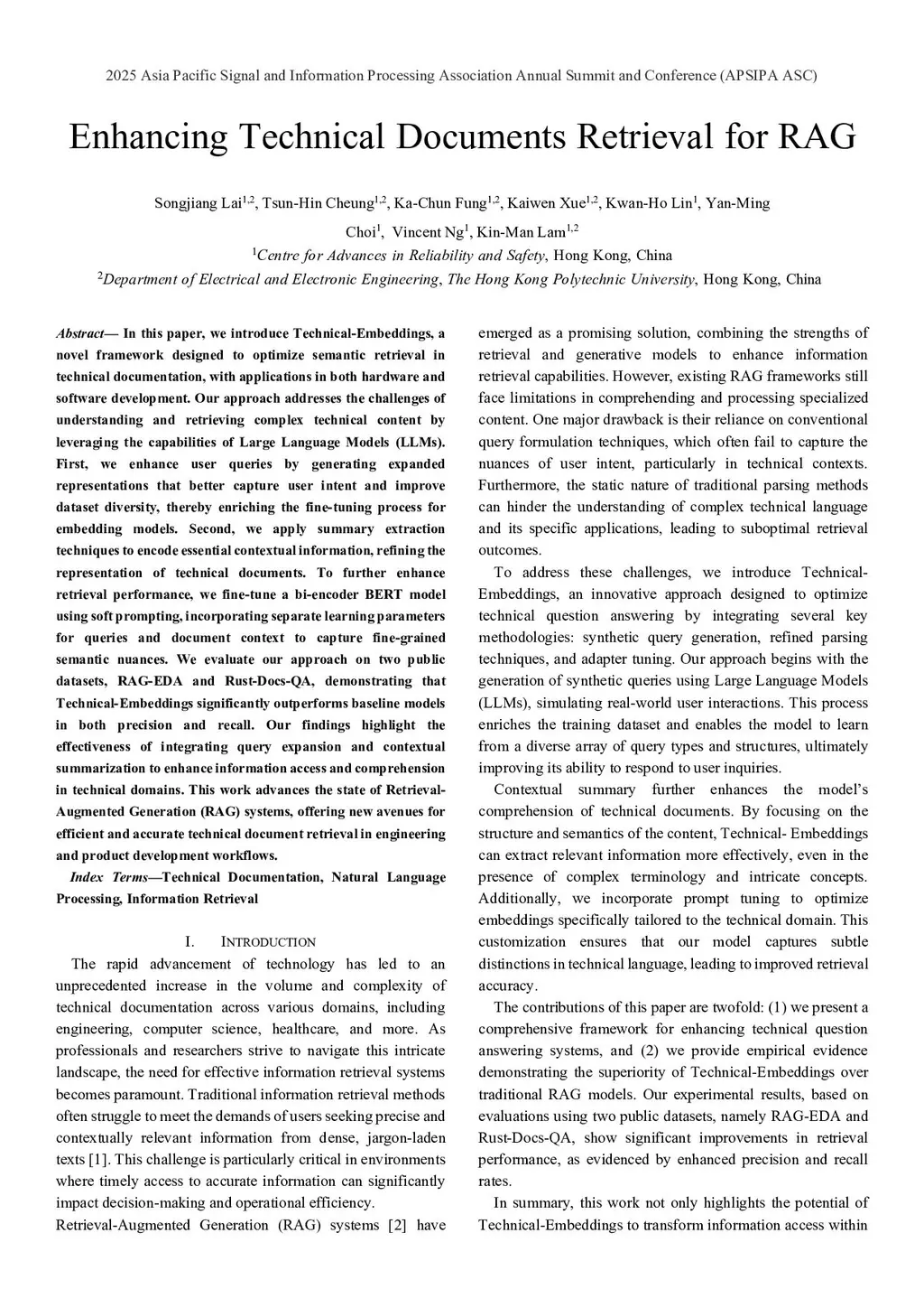 In this paper, we introduce Technical-Embeddings, a novel framework designed to optimize semantic retrieval in technical documentation, with applications in both hardware and software development. Our approach addresses the challenges of understanding and retrieving complex technical content by leveraging the capabilities of Large Language Models (LLMs). First, we enhance user queries by generating expanded representations that better capture user intent and improve dataset diversity, thereby enriching the fine-tuning process for embedding models. Second, we apply summary extraction techniques to encode essential contextual information, refining the representation of technical documents. To further enhance retrieval performance, we fine-tune a bi-encoder BERT model using soft prompting, incorporating separate learning parameters for queries and document context to capture fine-grained semantic nuances. We evaluate our approach on two public datasets, RAG-EDA and Rust-Docs-QA, demonstrating that Technical-Embeddings significantly outperforms baseline models in both precision and recall. Our findings highlight the effectiveness of integrating query expansion and contextual summarization to enhance information access and comprehension in technical domains. This work advances the state of Retrieval-Augmented Generation (RAG) systems, offering new avenues for efficient and accurate technical document retrieval in engineering and product development workflows.