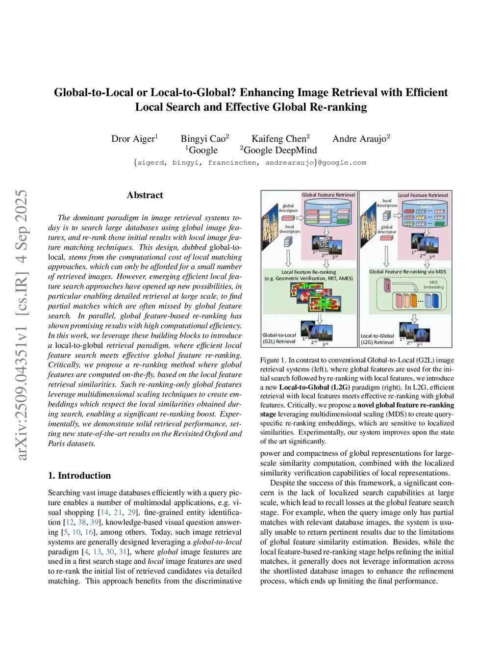 The dominant paradigm in image retrieval systems today is to search large databases using global image features, and re-rank those initial results with local image feature matching techniques. This design, dubbed global-to-local, stems from the computational cost of local matching approaches, which can only be afforded for a small number of retrieved images. However, emerging efficient local feature search approaches have opened up new possibilities, in particular enabling detailed retrieval at large scale, to find partial matches which are often missed by global feature search. In parallel, global feature-based re-ranking has shown promising results with high computational efficiency. In this work, we leverage these building blocks to introduce a local-to-global retrieval paradigm, where efficient local feature search meets effective global feature re-ranking. Critically, we propose a re-ranking method where global features are computed on-the-fly, based on the local feature retrieval similarities. Such re-ranking-only global features leverage multidimensional scaling techniques to create embeddings which respect the local similarities obtained during search, enabling a significant re-ranking boost. Experimentally, we demonstrate solid retrieval performance, setting new state-of-the-art results on the Revisited Oxford and Paris datasets.