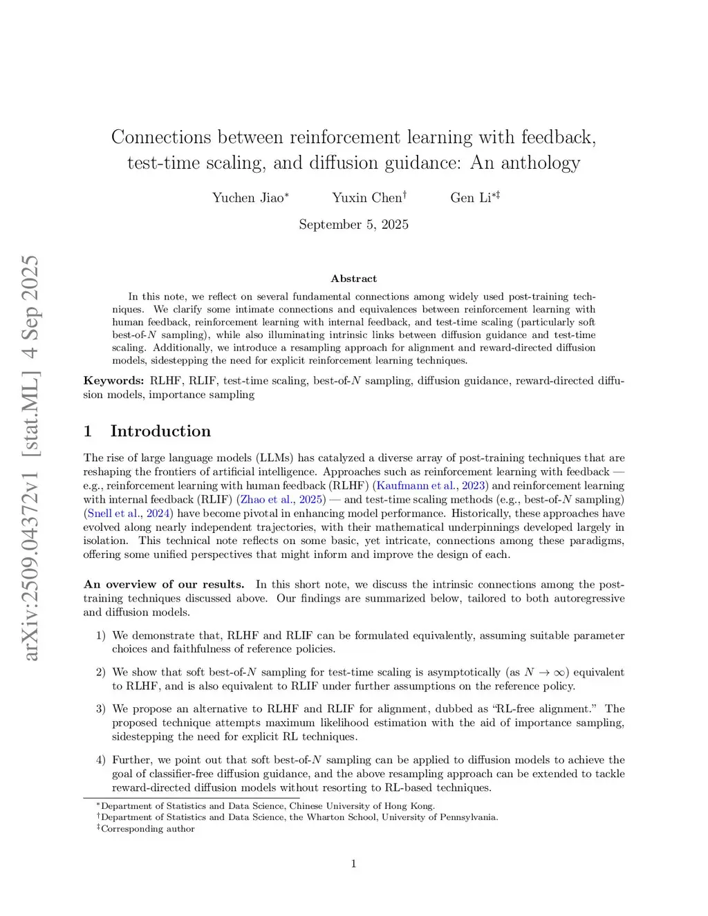 In this note, we reflect on several fundamental connections among widely used post-training techniques. We clarify some intimate connections and equivalences between reinforcement learning with human feedback, reinforcement learning with internal feedback, and test-time scaling (particularly soft best-of- sampling), while also illuminating intrinsic links between diffusion guidance and test-time scaling. Additionally, we introduce a resampling approach for alignment and reward-directed diffusion models, sidestepping the need for explicit reinforcement learning techniques.