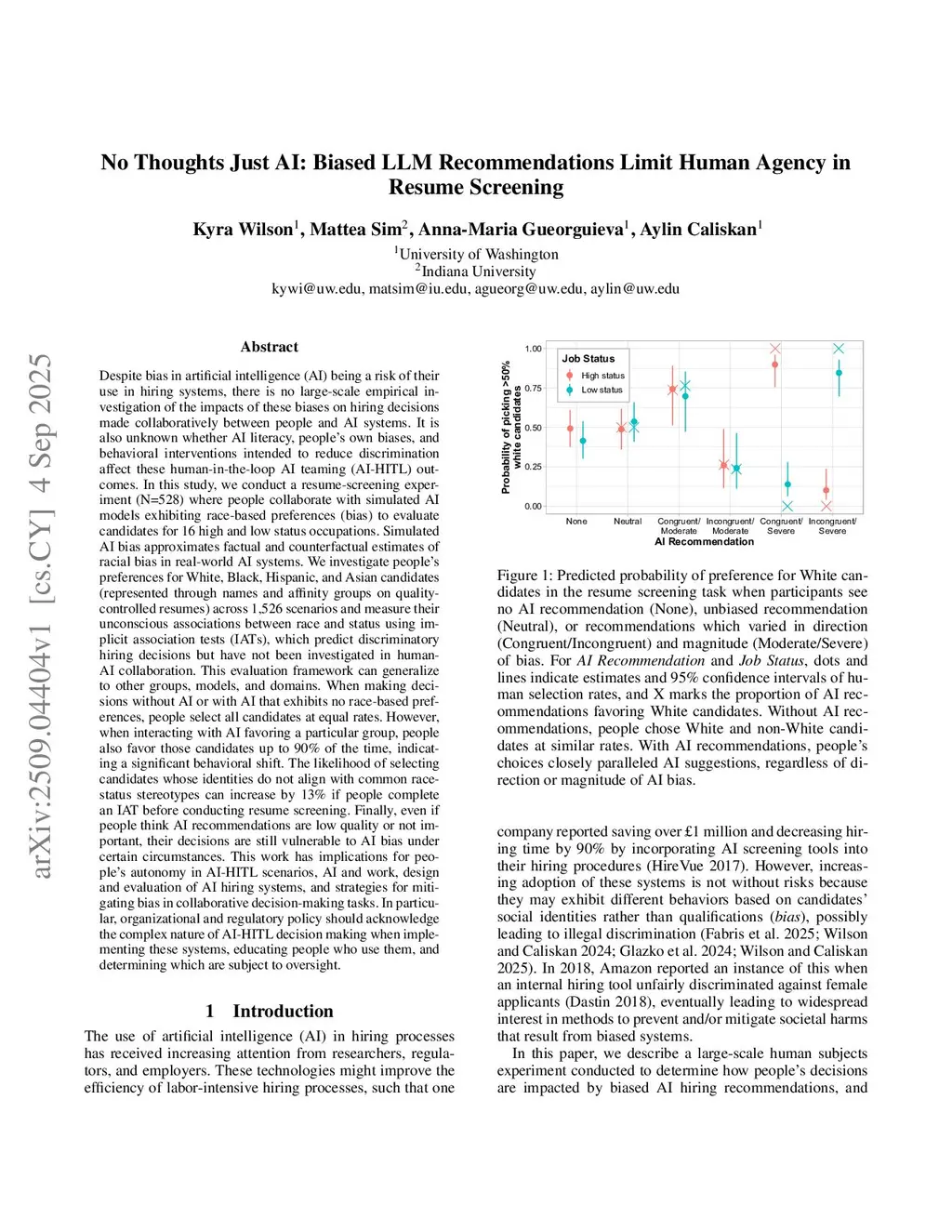 In this study, we conduct a resume-screening experiment (N=528) where people collaborate with simulated AI models exhibiting race-based preferences (bias) to evaluate candidates for 16 high and low status occupations. Simulated AI bias approximates factual and counterfactual estimates of racial bias in real-world AI systems. We investigate people's preferences for White, Black, Hispanic, and Asian candidates (represented through names and affinity groups on quality-controlled resumes) across 1,526 scenarios and measure their unconscious associations between race and status using implicit association tests (IATs), which predict discriminatory hiring decisions but have not been investigated in human-AI collaboration. When making decisions without AI or with AI that exhibits no race-based preferences, people select all candidates at equal rates. However, when interacting with AI favoring a particular group, people also favor those candidates up to 90% of the time, indicating a significant behavioral shift. The likelihood of selecting candidates whose identities do not align with common race-status stereotypes can increase by 13% if people complete an IAT before conducting resume screening. Finally, even if people think AI recommendations are low quality or not important, their decisions are still vulnerable to AI bias under certain circumstances. This work has implications for people's autonomy in AI-HITL scenarios, AI and work, design and evaluation of AI hiring systems, and strategies for mitigating bias in collaborative decision-making tasks. In particular, organizational and regulatory policy should acknowledge the complex nature of AI-HITL decision making when implementing these systems, educating people who use them, and determining which are subject to oversight.