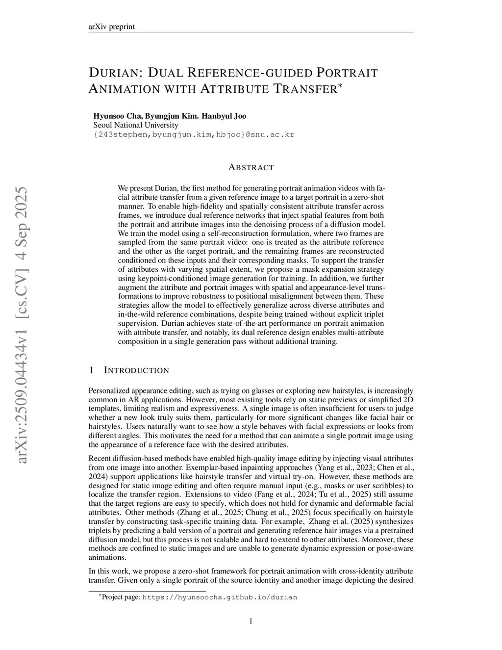 Durian: Dual Reference Image-Guided Portrait Animation with Attribute Transfer