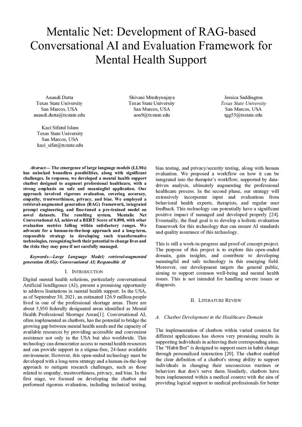 The emergence of large language models (LLMs) has unlocked boundless possibilities, along with significant challenges. In response, we developed a mental health support chatbot designed to augment professional healthcare, with a strong emphasis on safe and meaningful application. Our approach involved rigorous evaluation, covering accuracy, empathy, trustworthiness, privacy, and bias. We employed a retrieval-augmented generation (RAG) framework, integrated prompt engineering, and fine-tuned a pre-trained model on novel datasets. The resulting system, Mentalic Net Conversational AI, achieved a BERT Score of 0.898, with other evaluation metrics falling within satisfactory ranges. We advocate for a human-in-the-loop approach and a long-term, responsible strategy in developing such transformative technologies, recognizing both their potential to change lives and the risks they may pose if not carefully managed.