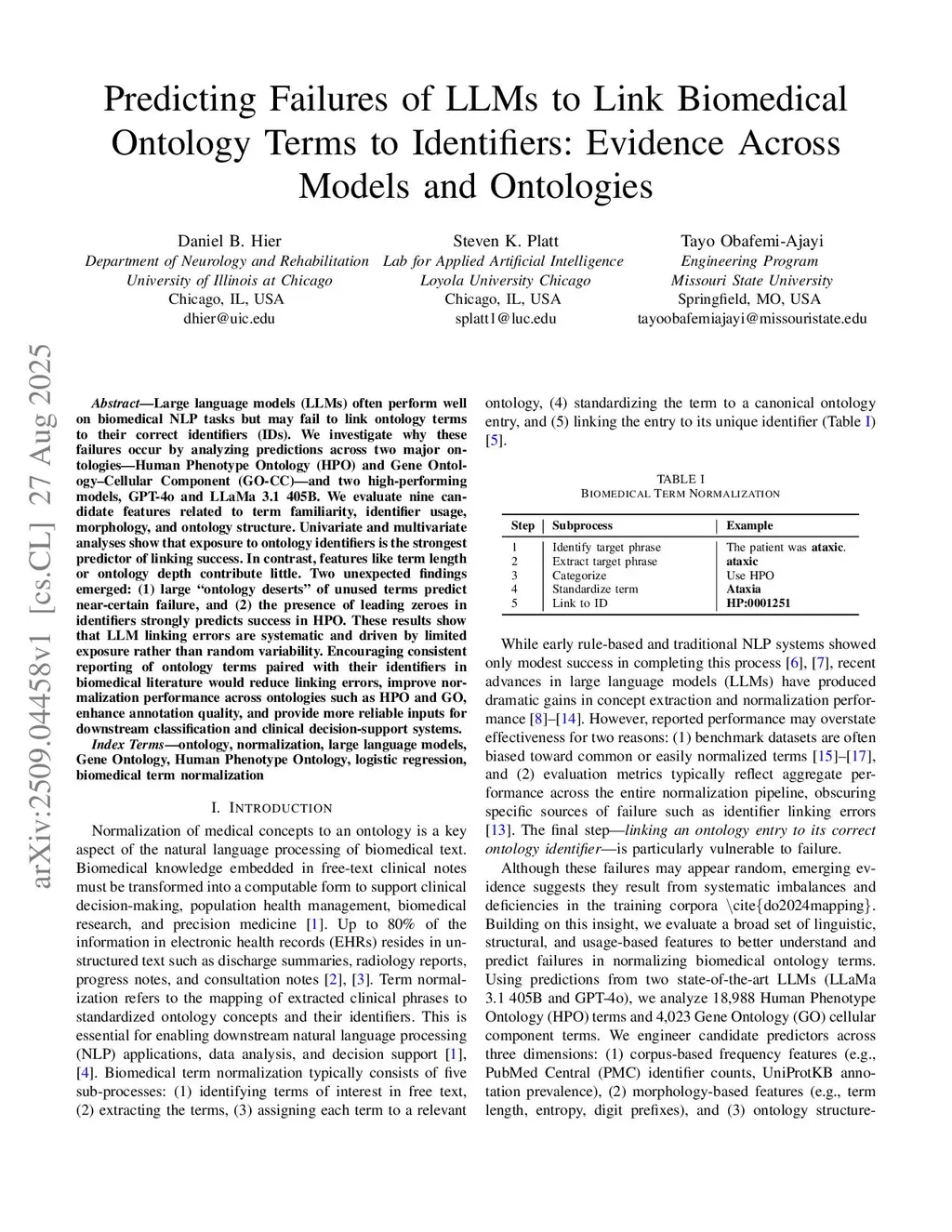 Predicting Failures of LLMs to Link Biomedical Ontology Terms to Identifiers Evidence Across Models and Ontologies