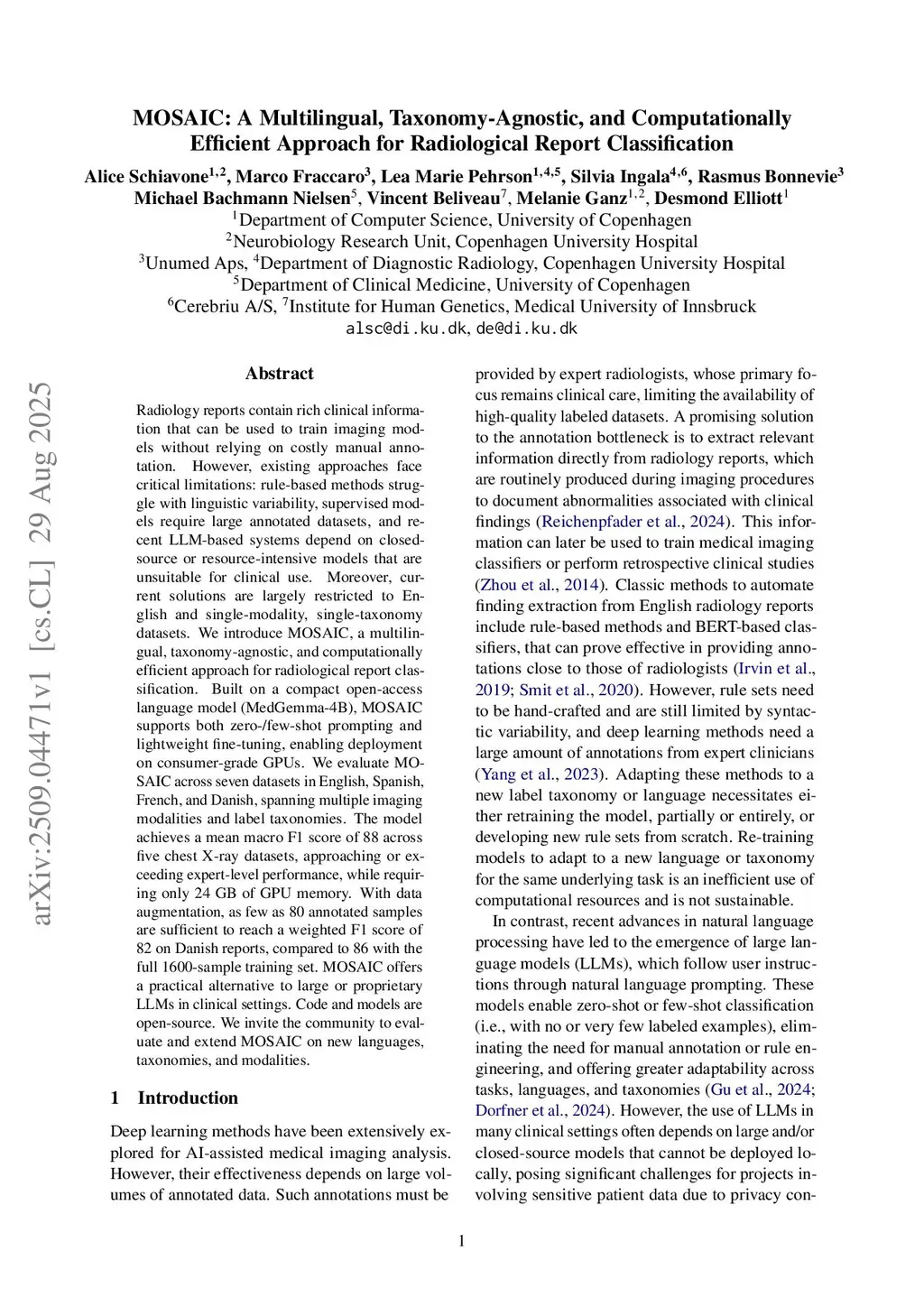 Radiology reports contain rich clinical information that can be used to train imaging models without relying on costly manual annotation. However, existing approaches face critical limitations: rule-based methods struggle with linguistic variability, supervised models require large annotated datasets, and recent LLM-based systems depend on closed-source or resource-intensive models that are unsuitable for clinical use. Moreover, current solutions are largely restricted to English and single-modality, single-taxonomy datasets. We introduce MOSAIC, a multilingual, taxonomy-agnostic, and computationally efficient approach for radiological report classification. Built on a compact open-access language model (MedGemma-4B), MOSAIC supports both zero-/few-shot prompting and lightweight fine-tuning, enabling deployment on consumer-grade GPUs. We evaluate MOSAIC across seven datasets in English, Spanish, French, and Danish, spanning multiple imaging modalities and label taxonomies. The model achieves a mean macro F1 score of 88 across five chest X-ray datasets, approaching or exceeding expert-level performance, while requiring only 24 GB of GPU memory. With data augmentation, as few as 80 annotated samples are sufficient to reach a weighted F1 score of 82 on Danish reports, compared to 86 with the full 1600-sample training set. MOSAIC offers a practical alternative to large or proprietary LLMs in clinical settings. Code and models are open-source. We invite the community to evaluate and extend MOSAIC on new languages, taxonomies, and modalities.
