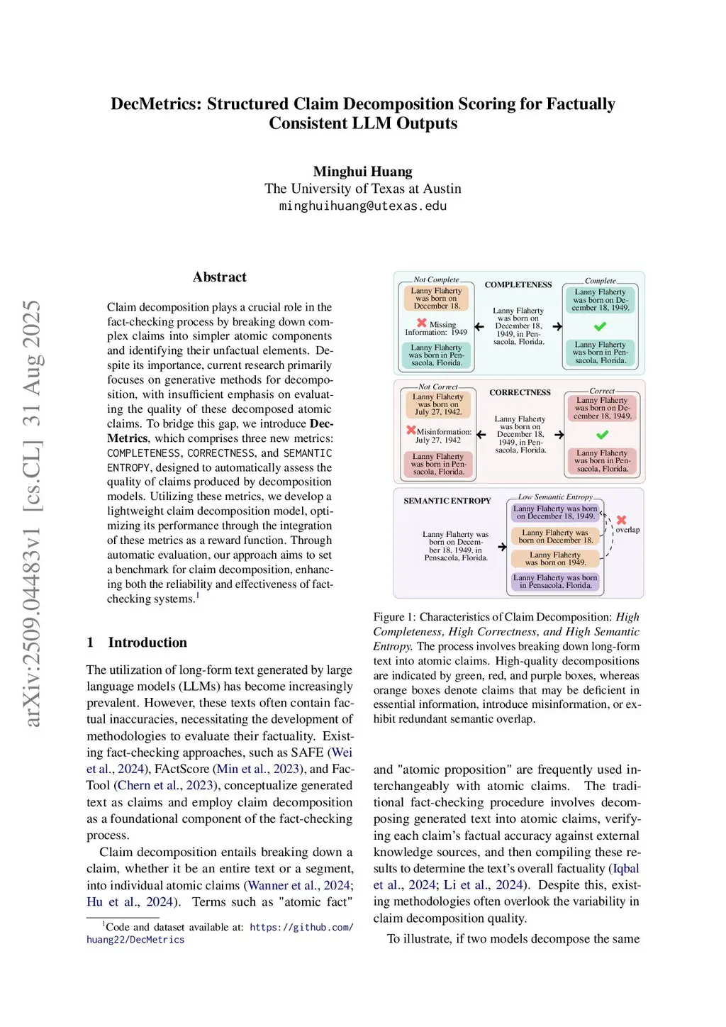DecMetrics: Structured Claim Decomposition Scoring for Factually Consistent LLM Outputs