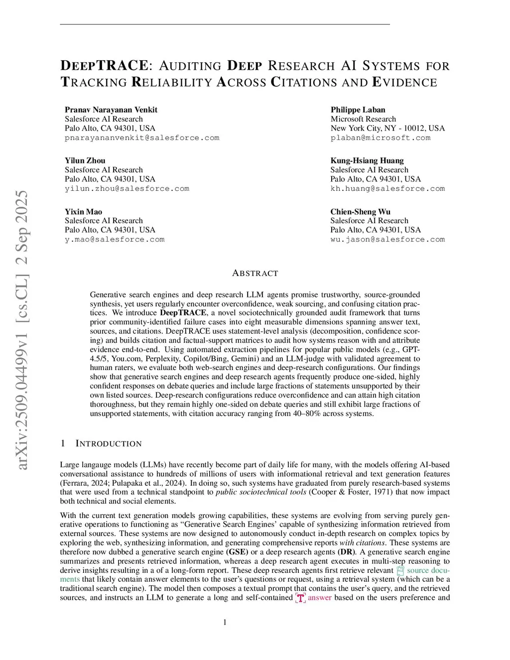 DeepTRACE: Auditing Deep Research AI Systems for Tracking Reliability Across Citations and Evidence