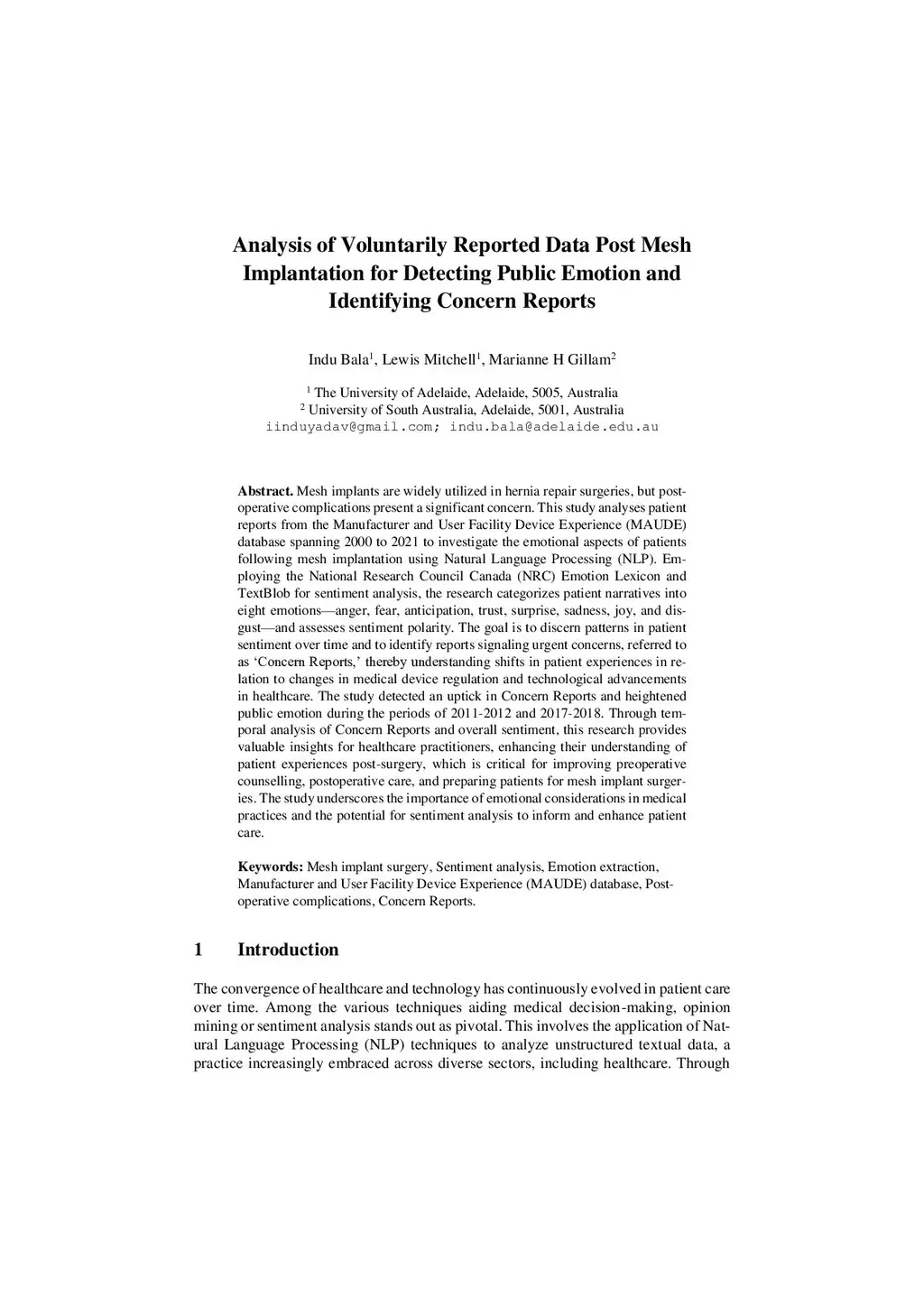 Analysis of Voluntarily Reported Data Post Mesh Implantation for Detecting Public Emotion and Identifying Concern Reports